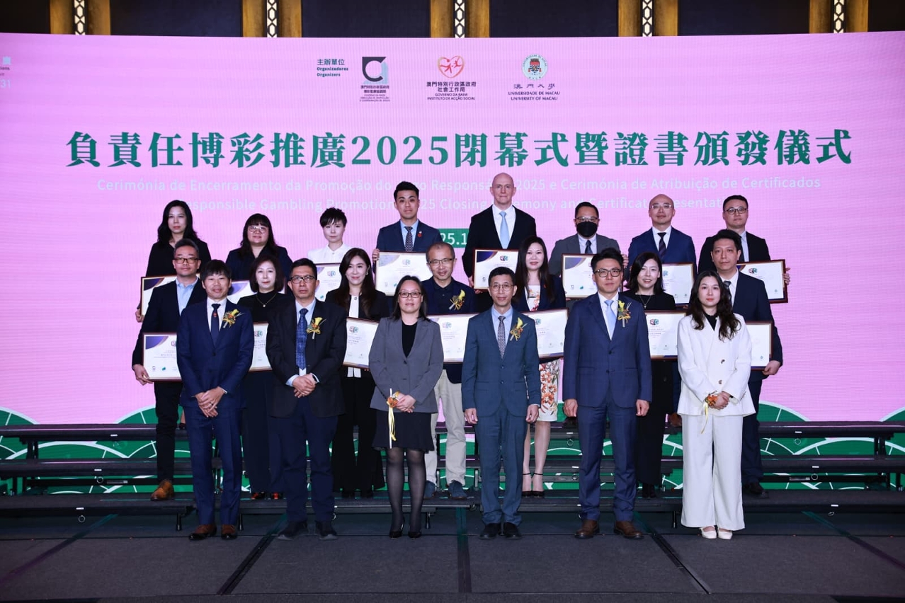 由社会工作局、博彩监察协调局及澳门大学博彩研究所合办的“负责任博彩推广2025闭幕式暨证书颁发仪式”,于12月17日下午在美狮美高梅酒店宴会厅顺利举行,来自博彩业界、社会服务界及学术界专家学者逾180人出席。