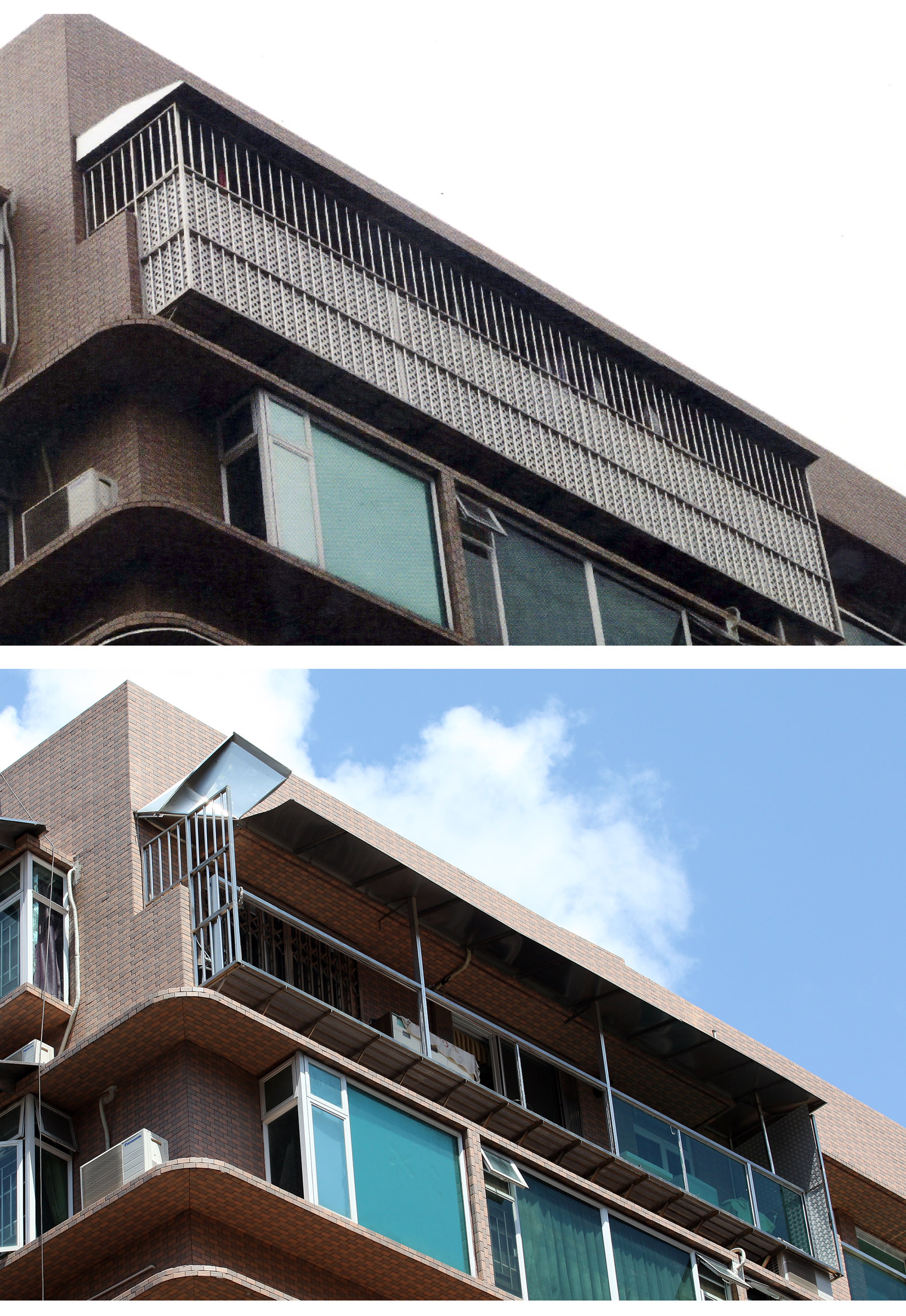 4樓單位的違法人至今僅自行清拆了天台的大型頂篷,至於簷篷和花籠,非但沒有一併拆除,反而在花籠的基礎上進一步換上玻璃欄河,改裝成一個僭建陽台;欄河的用料更與大廈原有的退縮平台相近,在外觀上不易發現,似有魚目混珠之嫌。