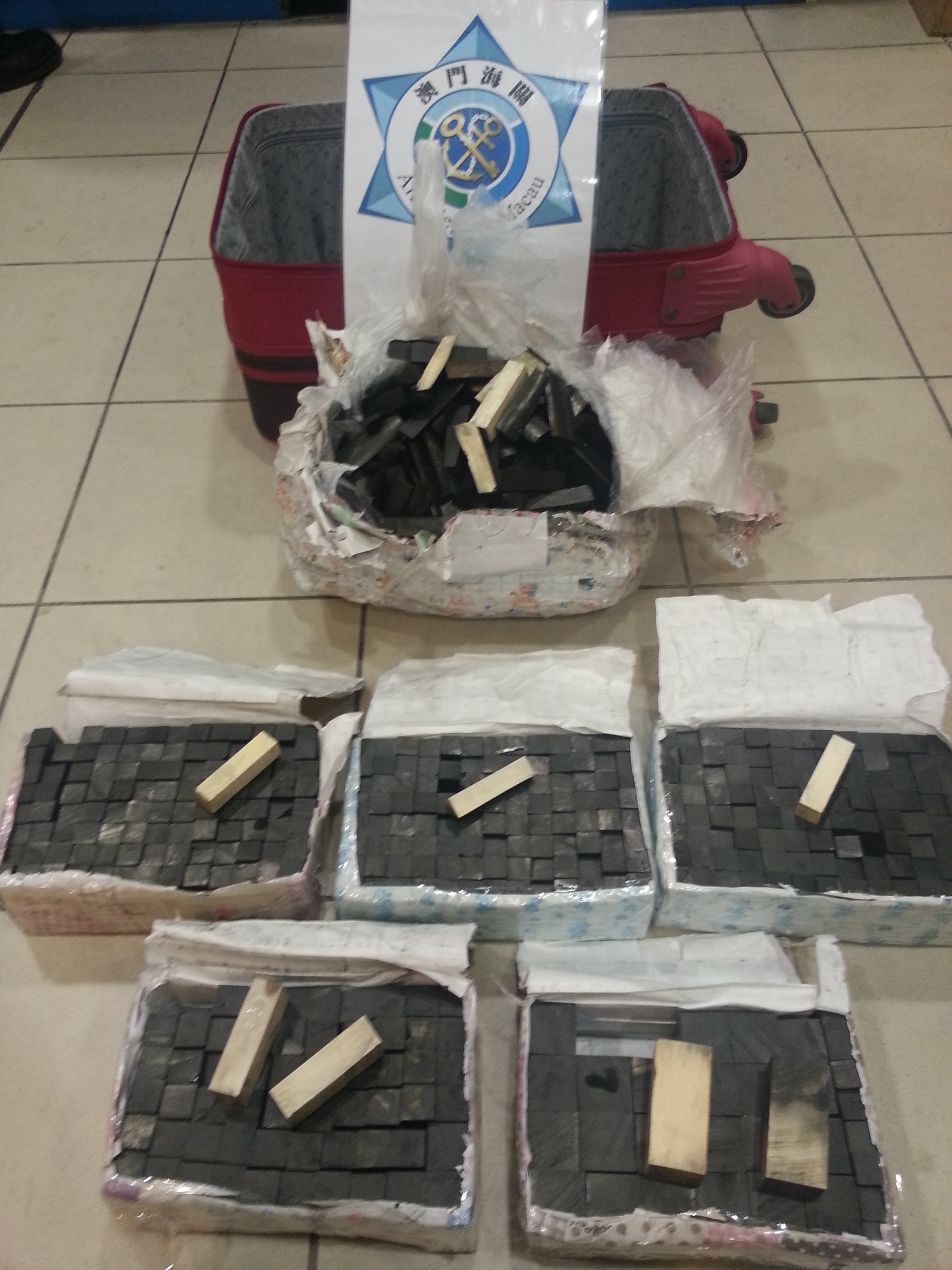 關員檢查上述行李過程,主要是經x光機檢查時,有關行李內有可疑,要求該旅客打開行李箱檢查,關員查詢有關物品時,旅客聲稱為『黑檀木』,關員在檢查期間發現旅客聲稱的『黑檀木』有退色現象,因此覺得可疑,使用清水沖刷後呈現牙骨的顏色,旅客承認上述聲稱的『黑檀木』小塊實為『象牙』,隨後聯絡民政總署專業人員作出初步檢定為『象牙』,有關物品是從台灣經香港進入本澳再運往內地。
