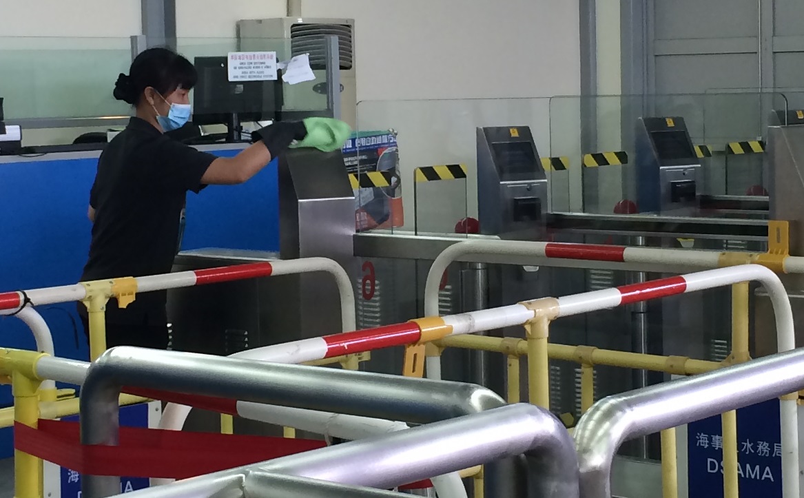 海事及水務局的人員今日到外港客運碼頭和氹仔臨時客運碼頭巡視。因應南韓的中東呼吸道綜合徵疫情,海事及水務局要求碼頭的管理公司和清潔公司加強日常的清潔消毒工作,以及增加清潔次數,確保碼頭環境的清潔衛生。