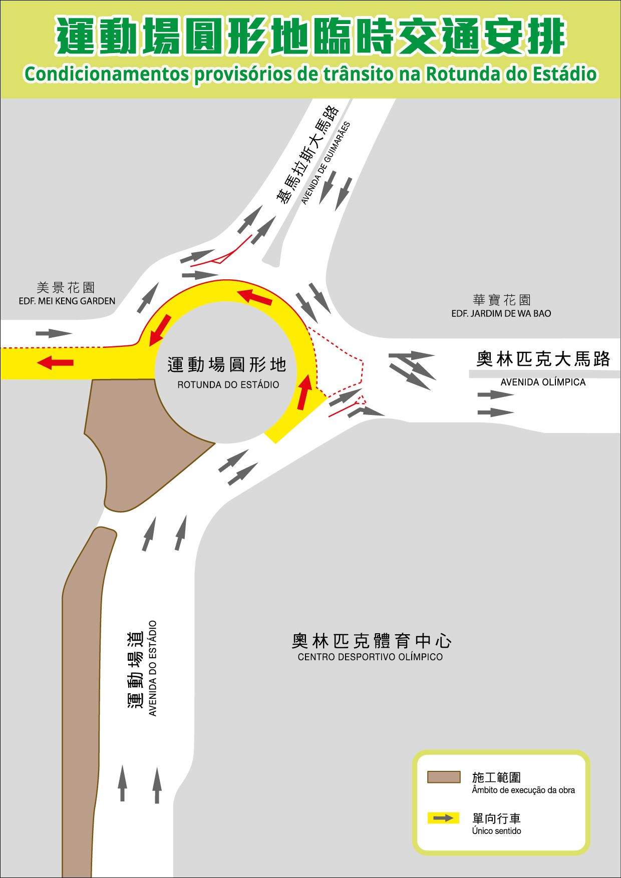 配合輕軌高架橋裝吊,運動場圓形地一帶路段上周六(25日)起實施系列臨時交通措施,為期約100天。在臨時措施實施初期,治安警察局因應實施交通狀況,臨時封閉由運動場圓形地轉入基馬拉斯大馬路之路口,即車輛經運動場道駛入運動場圓形地後,須往柯維納馬路方向行駛。經一段時間視察,有關調整對該處實施改道後的交通情況有一定幫助,有見及此,經交通事務局、治安警察局與三間巴士公司協調,就臨時交通改道之交通情況、行車安全、巴士運作等進行分析,並共識維持封閉運動場圓形地轉入基馬拉斯大馬路路口之安排,直至工程結束。