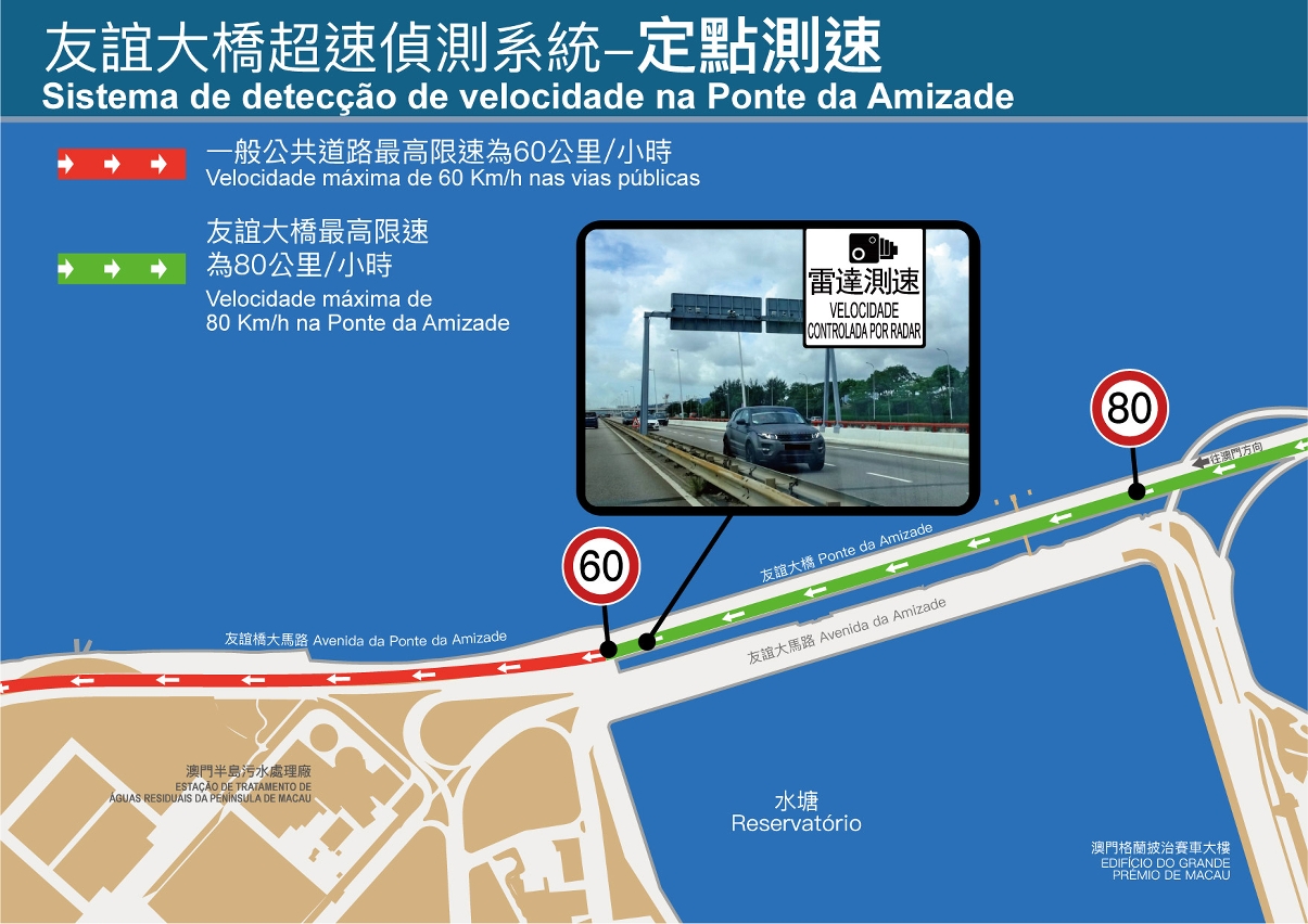 為加強保障道路使用者的安全,交通事務局與治安警察局於6月起試行友誼大橋近友誼大馬路引橋入口與友誼大橋近氹仔端出口路段 (澳門往氹仔方向) 之區間測速監控,以採集數據及讓駕駛者提前適應有關裝置;隨著試行情況理想,上述之區間測速監控連同位於友誼大橋近水塘路段(氹仔往澳門方向)新增之定點測速系統,將於7月1日(周一)起投入運作;屆時友誼大橋及連接橋樑之道路合共設有19套超速偵測監控設備。
