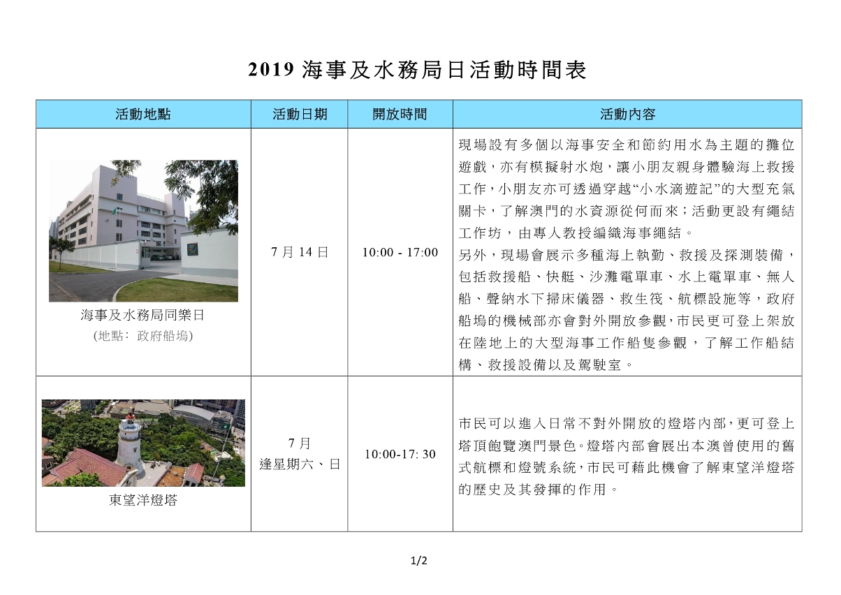 為慶祝7月18日“海事及水務局日”,局方將於7月舉行系列活動,與眾同樂,包括“海事及水務局同樂日”、“海事樂悠遊”等,而轄下的東望洋燈塔及海事博物館亦會免費對外開放。活動豐富有趣,老少咸宜,適合親子同樂,歡迎市民踴躍參與,豐富盛夏餘暇,充實海事見聞。活動詳情可瀏覽www.marine.gov.mo。