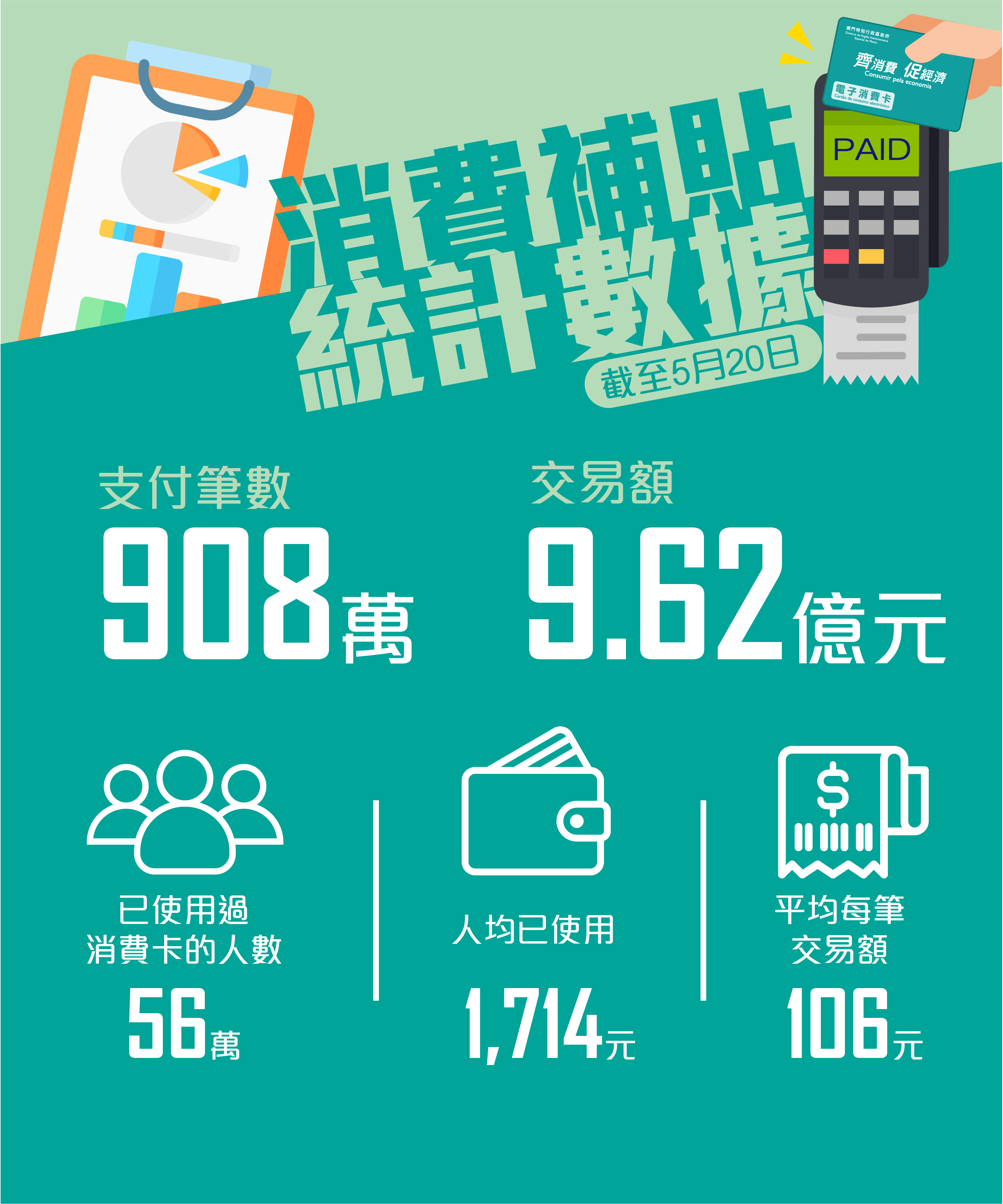 為提振經濟,擴大內需,特區政府向合資格居民發放電子消費卡,支持企業及紓緩疫症造成的影響,為本地各行各業注入強心針。電子消費卡自5月1日開始使用以來,首20天有超過908萬筆交易,已使用消費額約9.62億澳門元,超過已發放消費卡總額的一半。