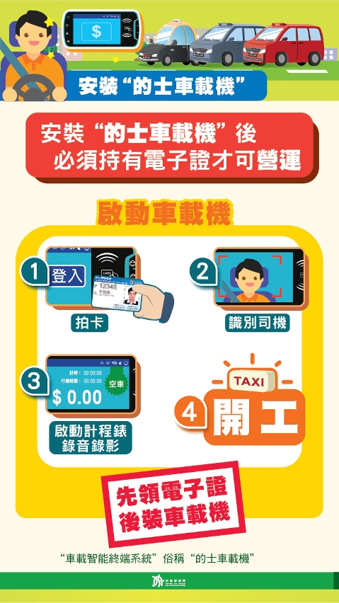 今年12月3日起,的士管理系統將全面啟用,所有的士必須備有車載機及透過“電子的士駕駛員證”登入才能從事客運服務;如已安裝車載機但未有電子證,將直接影響的士的正常營運。交通事務局目前接獲5,200多宗透過網上或親臨辦理電子的士駕駛員證的申請,約佔在職司機五成,呼籲業界先領電子證,後裝車載機,以確保無縫地繼續營運。
