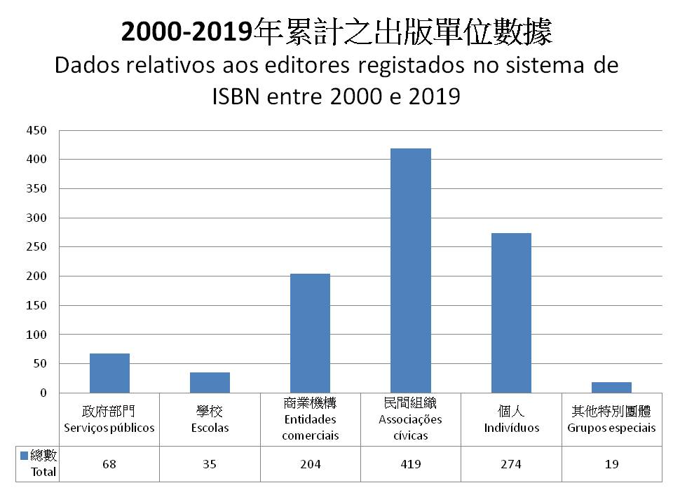 2019度新申請加入國際標準書號系統的出版單位共有65個(包括3個政府部門、17間商業機構、22個民間組織、22名個人及1個其他特別團體),較2018年增加6.8%,累計總數有1,019個,包括68個政府部門、35所學校、204間商業機構、419個民間組織、274名個人及19個其他特別團體,與2000年ISBN中心成立首年受理的62個出版單位相較,增幅超過16.4倍。數據反映,澳門特別行政區的出版事業正穩步發展,出版單位對於申辦國際標準書號的意識已日益增強,而圖書出版的國際標準化,將有利於澳門圖書推向國際市場。