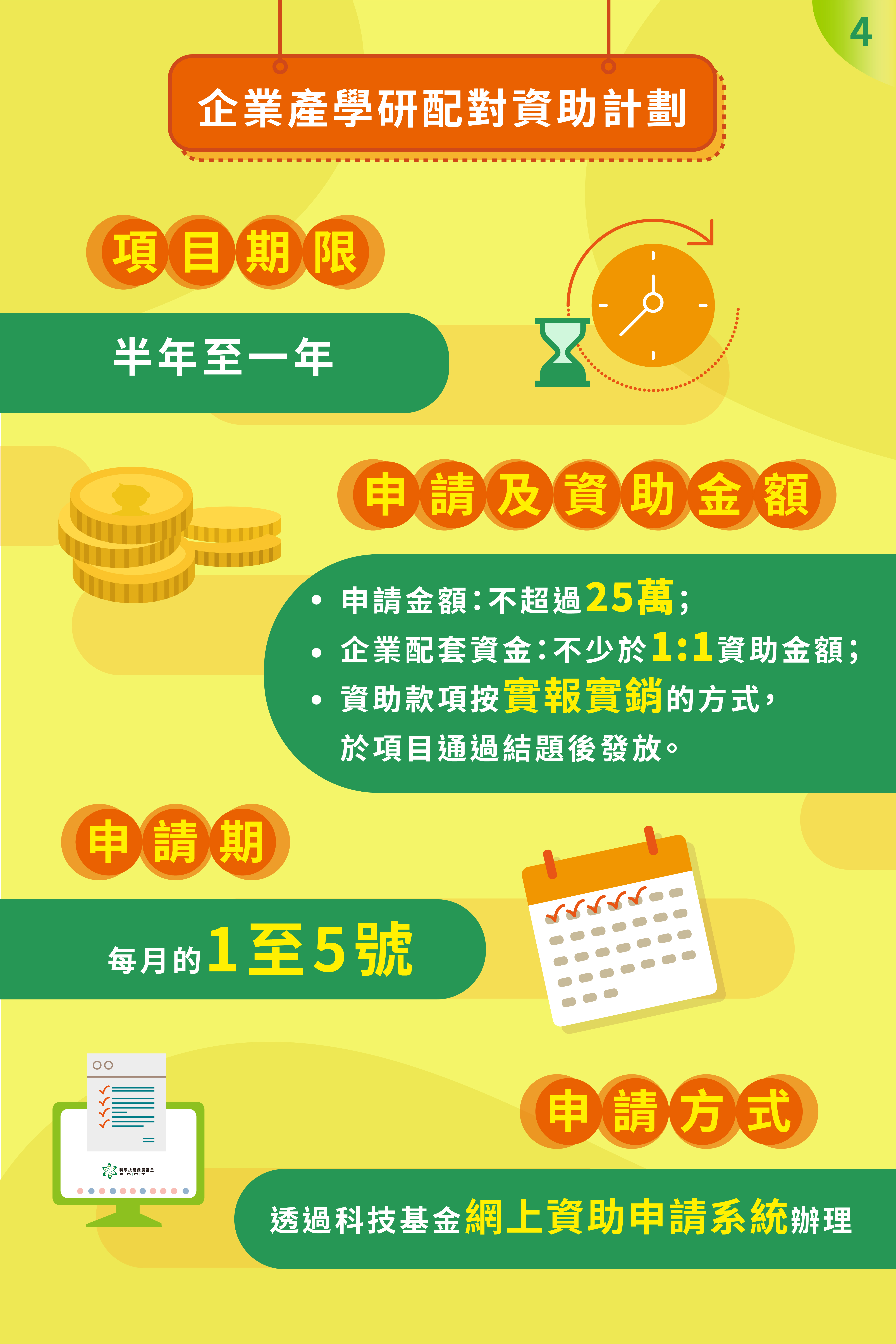 透過上述配對平台成功配對、且技術供給方為高校的前提下,企業可於自今年8月開始,每月1至5日透過上述平台向科技基金提出資助申請;每項申請的研究期限為半年至一年,申請金額不超過25萬澳門元。企業須投入配套資金,投入金額不少於獲資助金額。