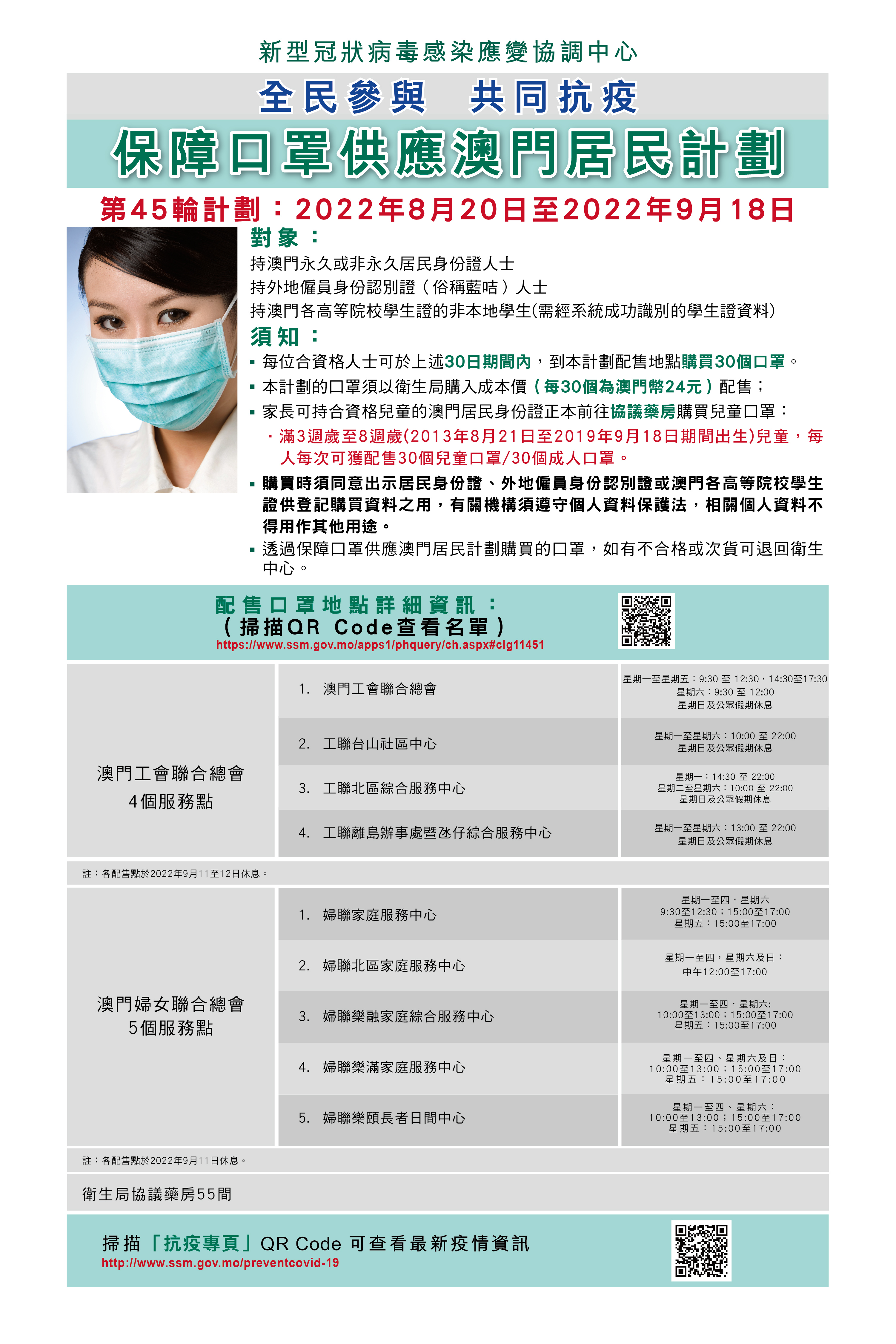 新型冠狀病毒感染應變協調中心表示,因疫情關係,上一輪(即第44輪)保障口罩供應澳門居民計劃(下稱“口罩計劃”)僅配售兒童外科口罩,現時本澳已進入防疫常態化階段,明(20)日開始的第45輪保障口罩計劃恢復配售成人及兒童外科口罩,配售期間為30日,即8月20日至9月18日,每人可一次性購買30個口罩,售價合共24澳門元。衛生局協議藥房、本澳2個社團(工聯、婦聯)繼續提供配售口罩服務。其中工聯轄下驛站於本輪停止配售,即全澳共有64個配售點,服務時間詳見附圖。透過口罩計劃購買的口罩,如有不合格或次貨可退回衛生中心。