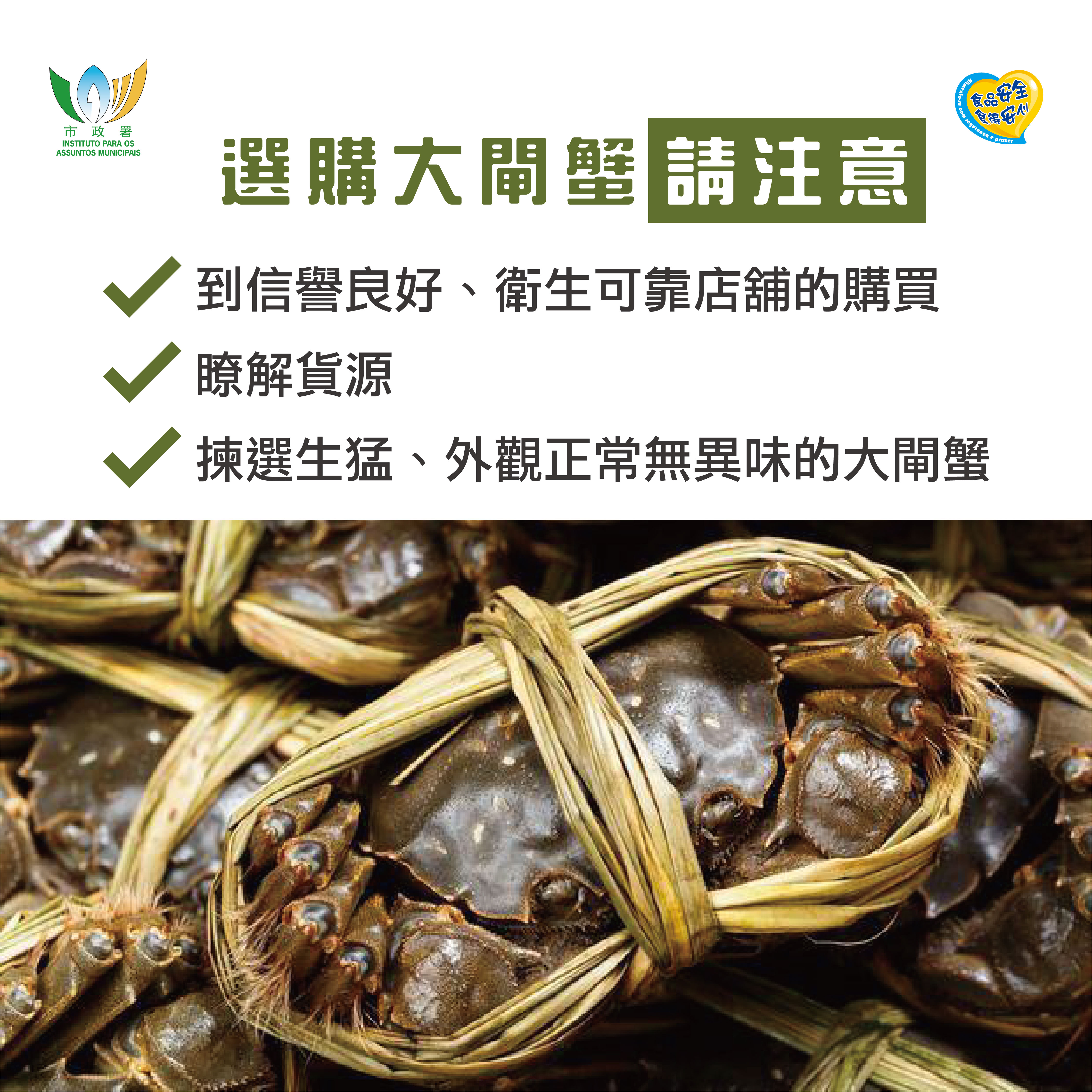 此外,消費者應於信譽良好及衛生可靠的店舖選購大閘蟹,並須清楚貨品來源。選購大閘蟹應以生猛、外殼完整有光澤、沒有異味為佳,進食前必須徹底煮熟。一旦蟹隻死亡,容易滋生大量微生物,不宜繼續烹煮食用。