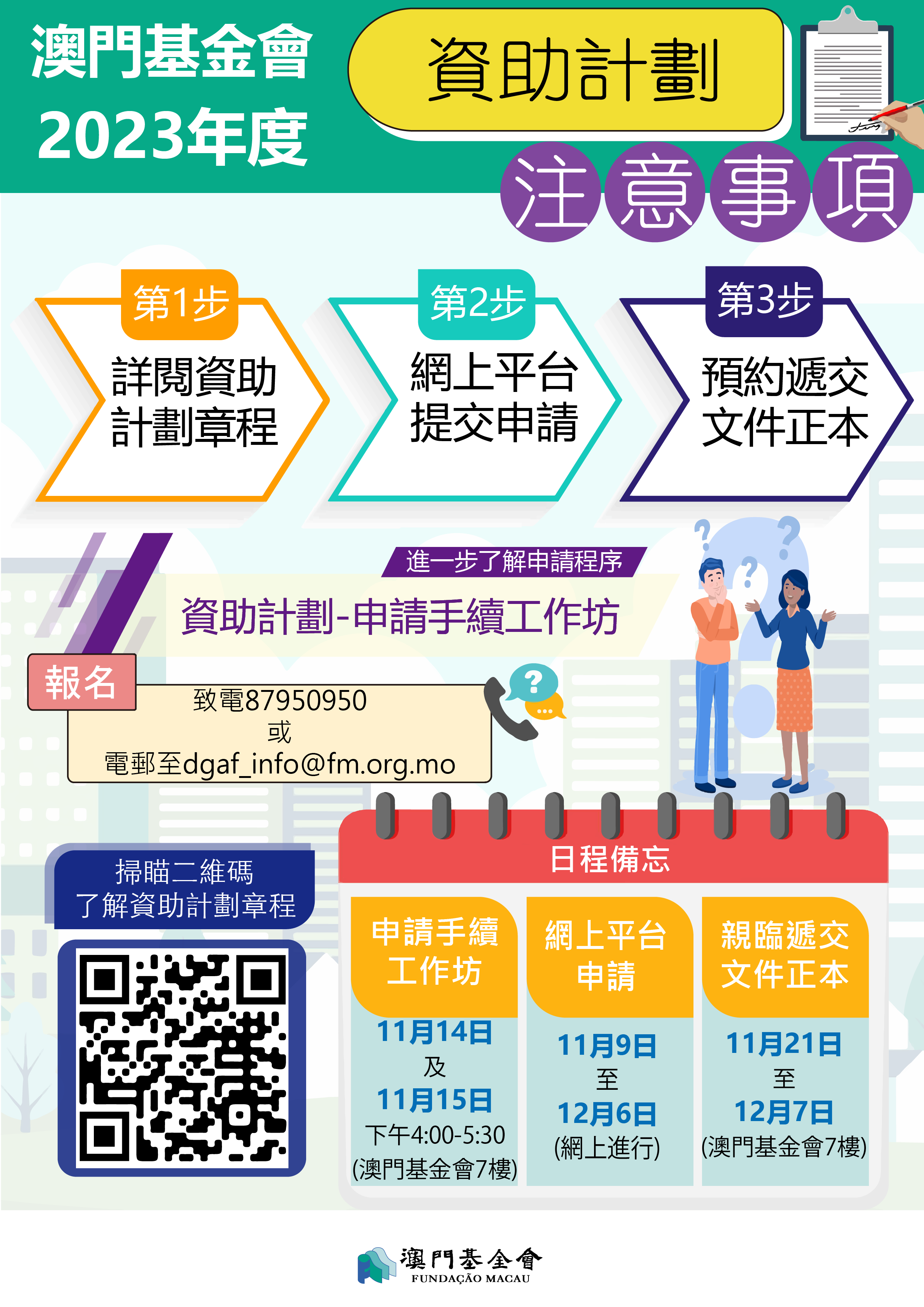為支持社團做好活動策劃,進一步了解申請程序,澳基會將於11月14日及15日下午4時至5時30分在澳門新馬路永光廣場7樓舉行“資助計劃-申請手續工作坊”,有意參加者可發送電郵至dgaf_info@fm.org.mo或於辦公時間致電87950950報名留座。