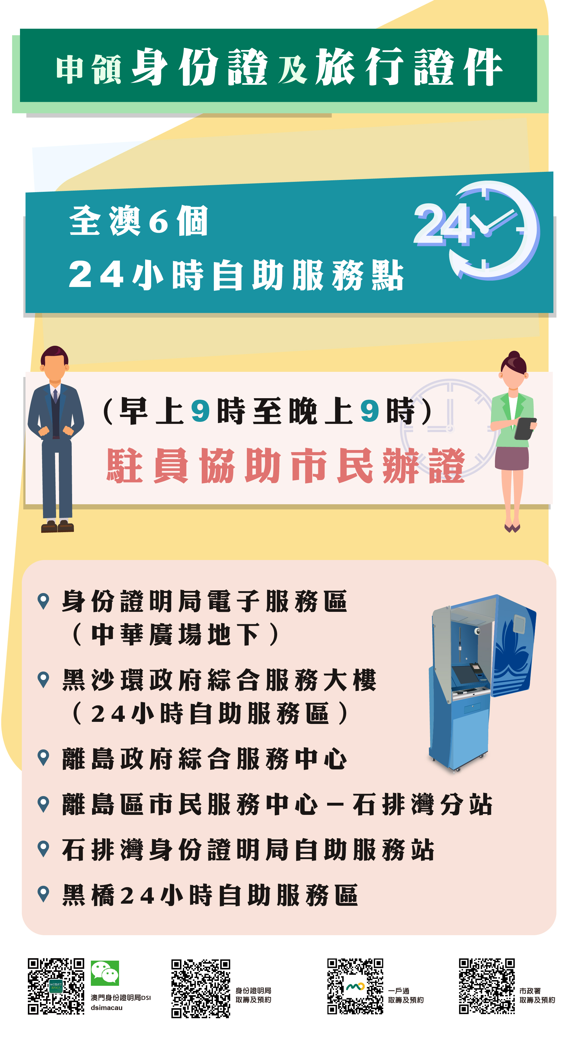 為協助市民更好利用設置在各區的自助服務機,自明(7)日起,身份證明局亦將於每日早上9時至晚上9時,在全澳6個24小時自助服務區,派專人協助市民辦證,提升自助辦證的效率。有關24小時自助服務點位置及詳情,請參閱 www.dsi.gov.mo/kiosk_c.jsp。
