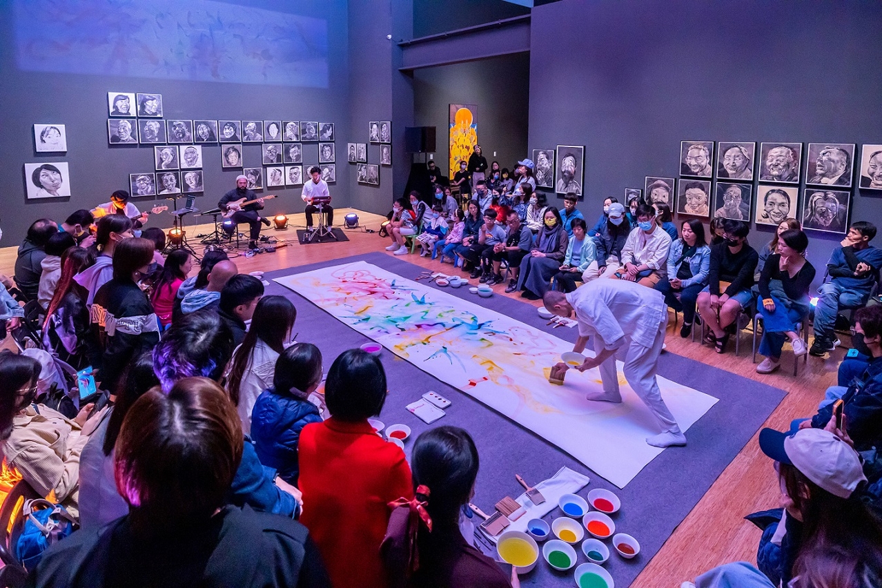 重點活動之一“視覺×音樂——藝術跨界表演《暗處光》”特於“塵光――方力鈞個展”展場舉行,由藝術策劃人陸竹夥拍澳門年青藝術家范世康、音樂人洪逸宇、福島章嗣及Ivan Wing共同創作,在燈影與樂聲交織中,巨幅畫紙上潑灑出斑斕水彩,在重彩筆觸盤繞中浮現出觀眾的速寫,與展場中當代藝術家方力鈞創作的標誌性光頭形象和友人的“人&像”互相輝映,透過展演,有觀眾深深感受到冬去春來、暗處逢光的人間溫暖,期望藝博館推出更多元的藝術跨界活動。另外,是次“視覺×影像——藝術電影放映”選映的電影之一《牆紙與膠水》記錄了炙手可熱的法國藝術家JR創作大型戶外攝影作品的經過,以獨特的人物刻劃和凌厲的視覺風格,讓無名之眾透過藝術的力量重新被看見、受關注。電影充滿人文關懷,非常動人,有觀眾更表示被藝術家所言的“藝術沒有任何邊界和限制”深受啟發。
