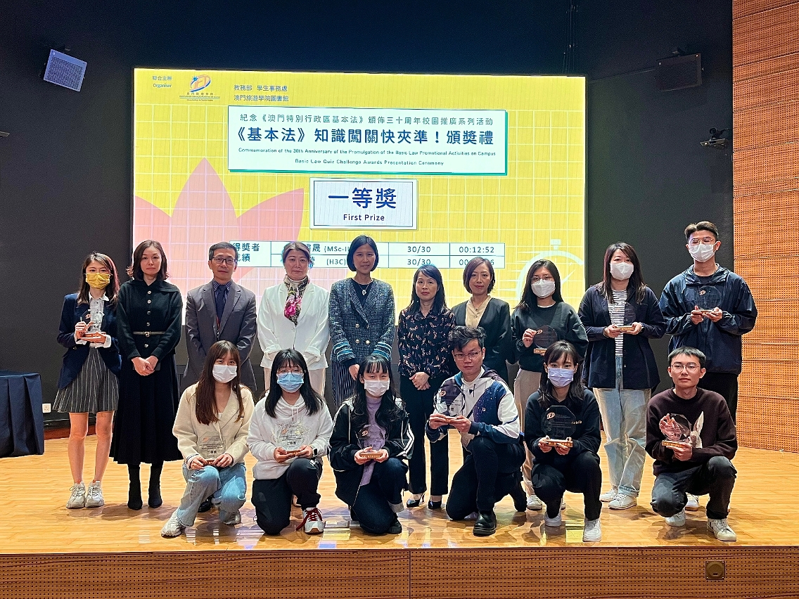 三月十五日至二十六日線上舉行的“《基本法》知識闖關快夾準!快答挑戰”答問計時比賽,邀請學院全體學生參加,比賽要求回答準而快,逾百學生參與。活動除了提高學生對《憲法》、《基本法》及「一國兩制」內容的認識,同時促進學習《基本法》的風氣和增強學生的國家觀念。學院於三月二十九日在望廈校區進行頒奬儀式,向獲得一等、二等及三等獎的學生頒獎,以鼓勵學生們在比賽中取得的優異成績。出席的學院代表包括澳門旅遊學院呂劍英副院長、羅曼儀副院長、教務部林寶玉教務長、學生事務處朱振榮處長、圖書館李嘉汶館長及梁詩琪講師。