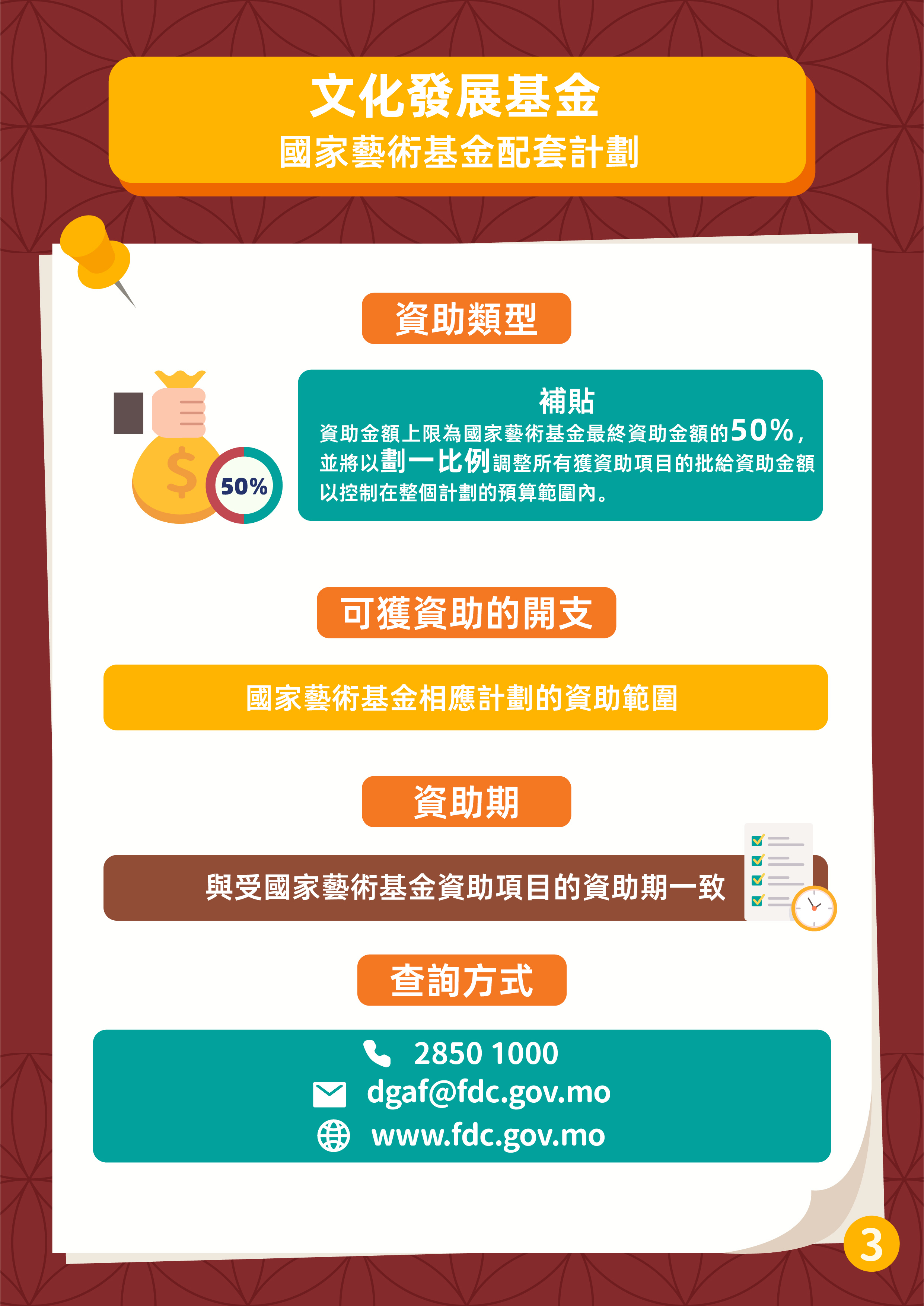 為支持獲得國家藝術基金資助的澳門文化藝術項目落實執行及鼓勵澳門藝術機構和藝術工作者積極申報國家藝術基金,文化發展基金推出“國家藝術基金配套計劃”,申請期由4月11日至5月31日,接受本項計劃申請期首日開始時(即2023年4月11日)尚未向國家藝術基金提交結項的澳門特區項目的申請。配套計劃為補貼形式,不限名額。