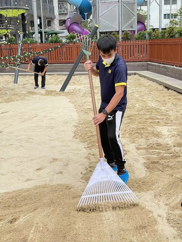 • 工作人員清潔林茂塘臨時休憩區沙池