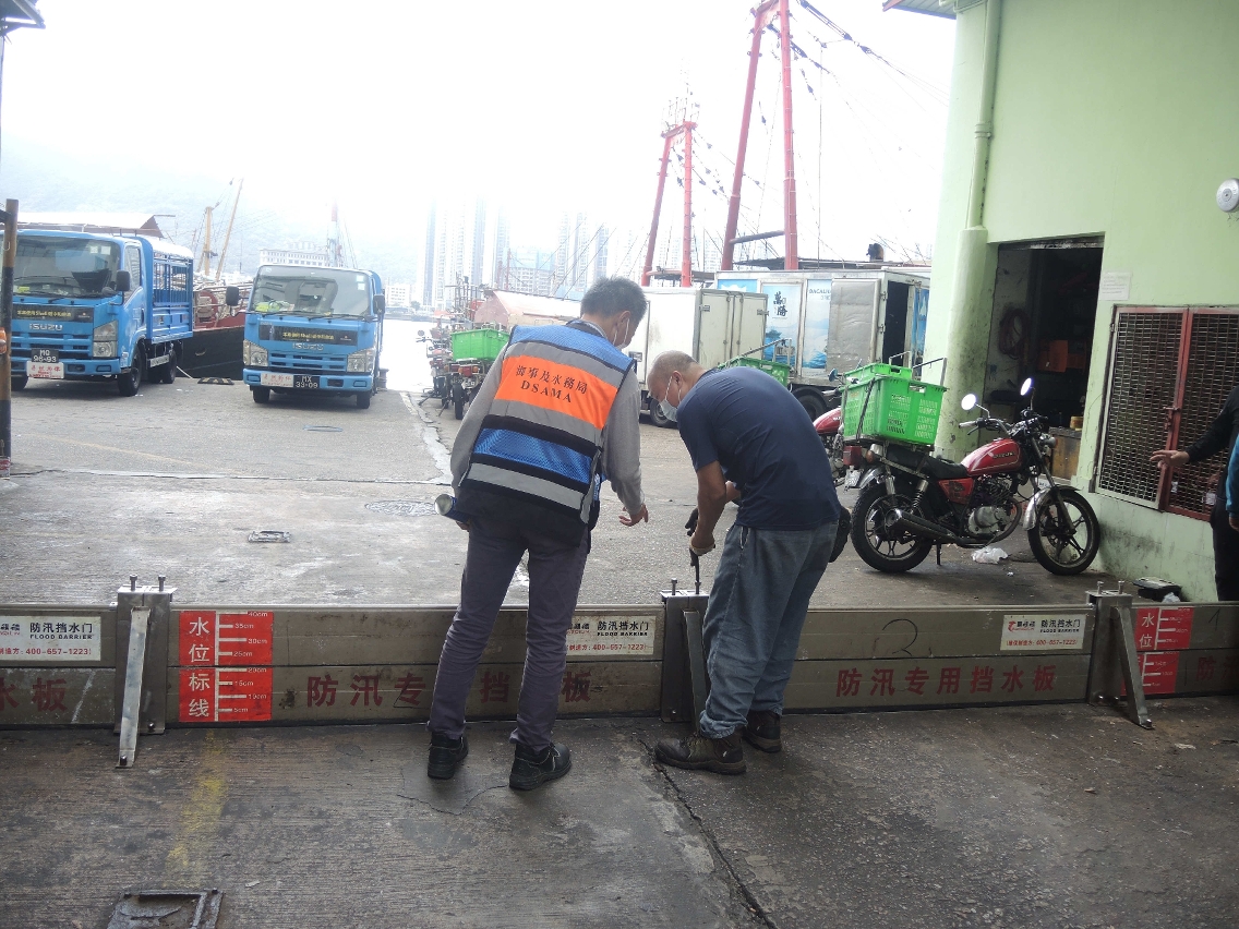 為配合內港臨時防洪工程之實施,海事局已與內港各碼頭建立完善的預警緊急通報機制。當氣象局發出黃色或以上的風暴潮警告,海事局會通知內港碼頭安裝防水旱閘擋水板。