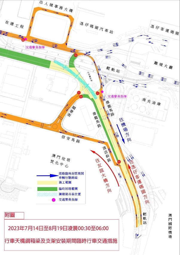 配合公共建設局進行四橋偉龍連接線的高架橋吊裝工作,氹仔偉龍馬路及周邊道路於7月13日(周四)晚上11時30分起,在警方協助下實施臨時交通管制措施(詳見附表及圖);此外,26、51、MT1、MT4及N2巴士路線,於7月14日(周五)至8月19日(周六),每日凌晨零時30分至早上6時改道行駛,其中51路線期間不停靠“北安大馬路/和睦街"巴士站,乘客可選擇於“信安馬路"巴士站搭乘有關路線,其他路線的停靠站點則維持不變。詳情請留意兩巴網站(http://www.tcm.com.mo/ 及 https://www.transmac.com.mo/)。