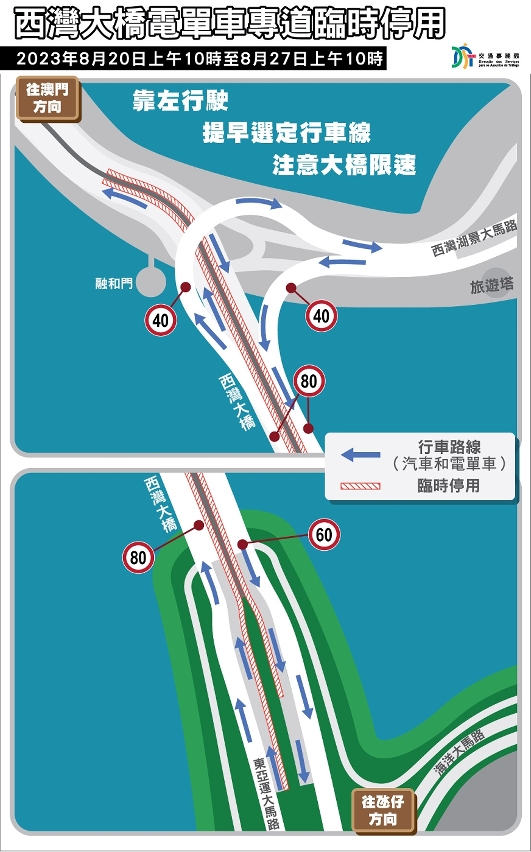 配合西灣大橋更換伸縮縫工程推進,8月20日(周日)上午10時至8月27日(周日)上午10時,須臨時停用西灣大橋電單車專道,以便進行專道內伸縮縫的更換工作。期間,電單車可在西灣大橋其他車道行駛,並可使用西灣大橋的各個出入口,即西灣湖景大馬路近媽閣及近旅遊塔一側引橋,以及氹仔東亞運大馬路上層及下層之引橋進出西灣大橋。
