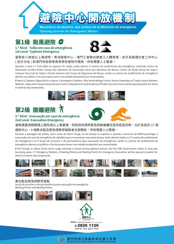 社會工作局正致電低窪地區人士撤離名單資料庫中的市民,確認他們的撤離需求,如有需要,亦會透過執行疏散撤離部門協助撤離到避險中心。此外,亦透過民間團體關懷低窪地區的弱勢人士,了解他們是否能夠投親靠友,並作好有關的協調聯絡。市民可登入社工局網頁 www.ias.gov.mo,瀏覧有關避險中心的資訊,居民如有特殊輔助需要,可致電28261126求助。