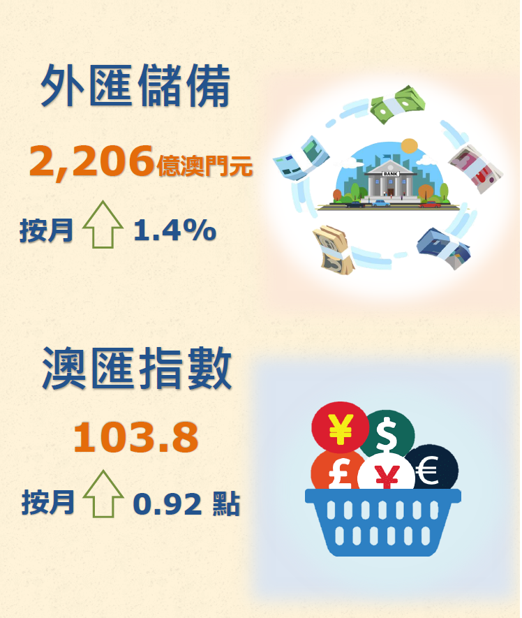 澳門金融管理局今(14)日公佈,2023年8月底澳門特別行政區的外匯儲備資產總額,初步統計為2,206億澳門元(273.0億美元),較2023年7月經修訂總額2,174億澳門元(270.7億美元),上升了1.4%。2023年8月底的外匯資產總額,約相當於2023年7月底澳門流通貨幣的11倍或廣義貨幣供應(M2)中屬於澳門元部分的88.0%。