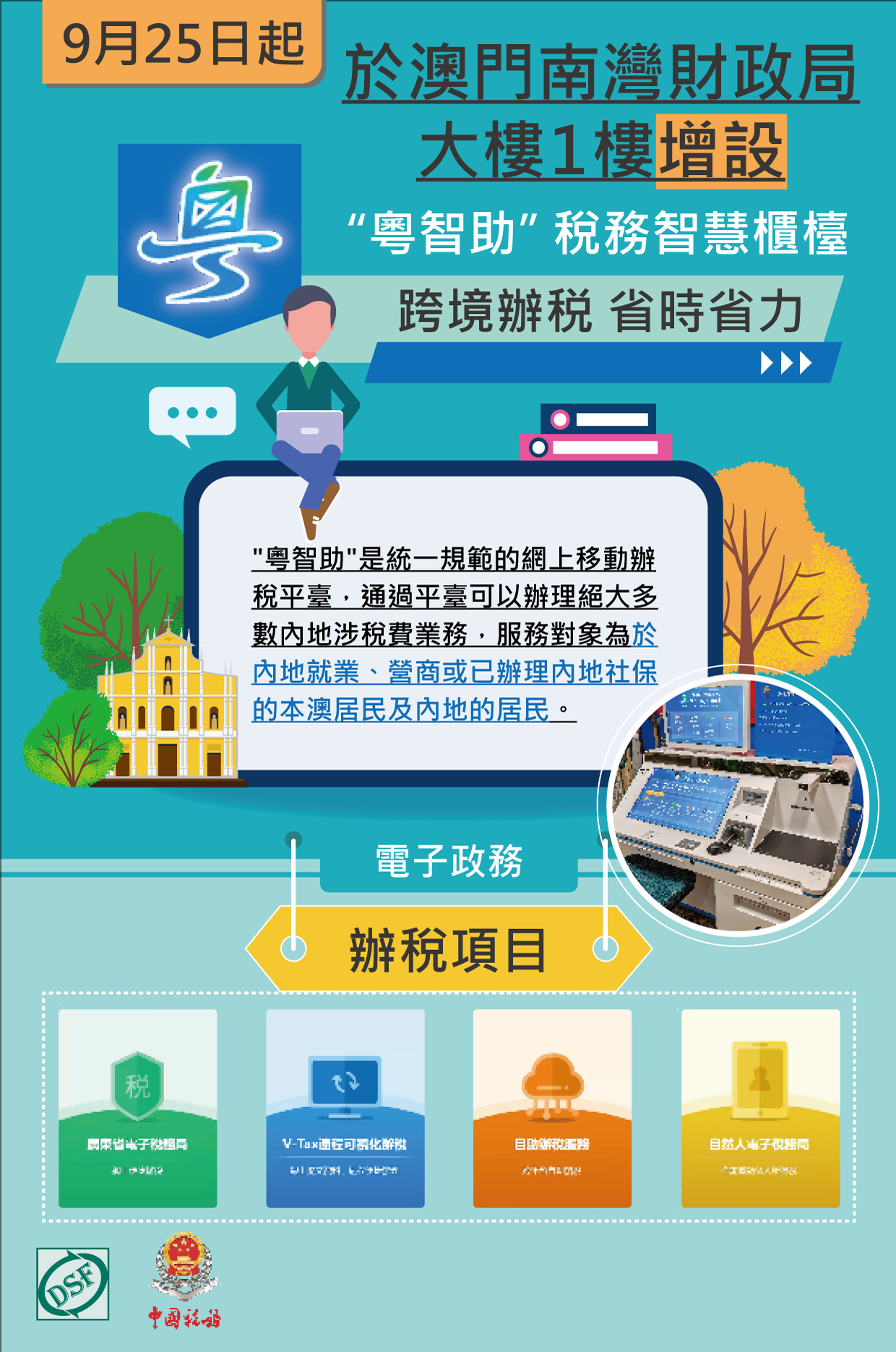 繼9月11日分設於深合區智慧稅務服務廳以及政務服務中心的澳門財政局自助服務機正式啟用後,設於澳門南灣財政局大樓1樓的粵智助今(25日)亦正式啟用,提供包括自助辦稅服務、廣東省電子稅務局、自然人電子稅務局功能等自助服務。