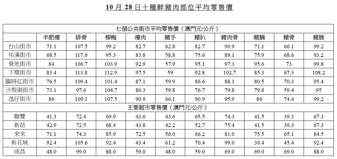 本澳活豬批發價由10月27日起,由每司馬擔(即60.48公斤)澳門元1960元下調至1600元,公共街市的豬肉檔及超市、零售店的鮮豬肉零售價也按相應比例作出調整,市政署由今(28日)起,一連七天公布本澳七個公共街市及主要超市的十種鮮豬肉的平均零售價,以提升市場價格的透明度,保障消費者權益。
