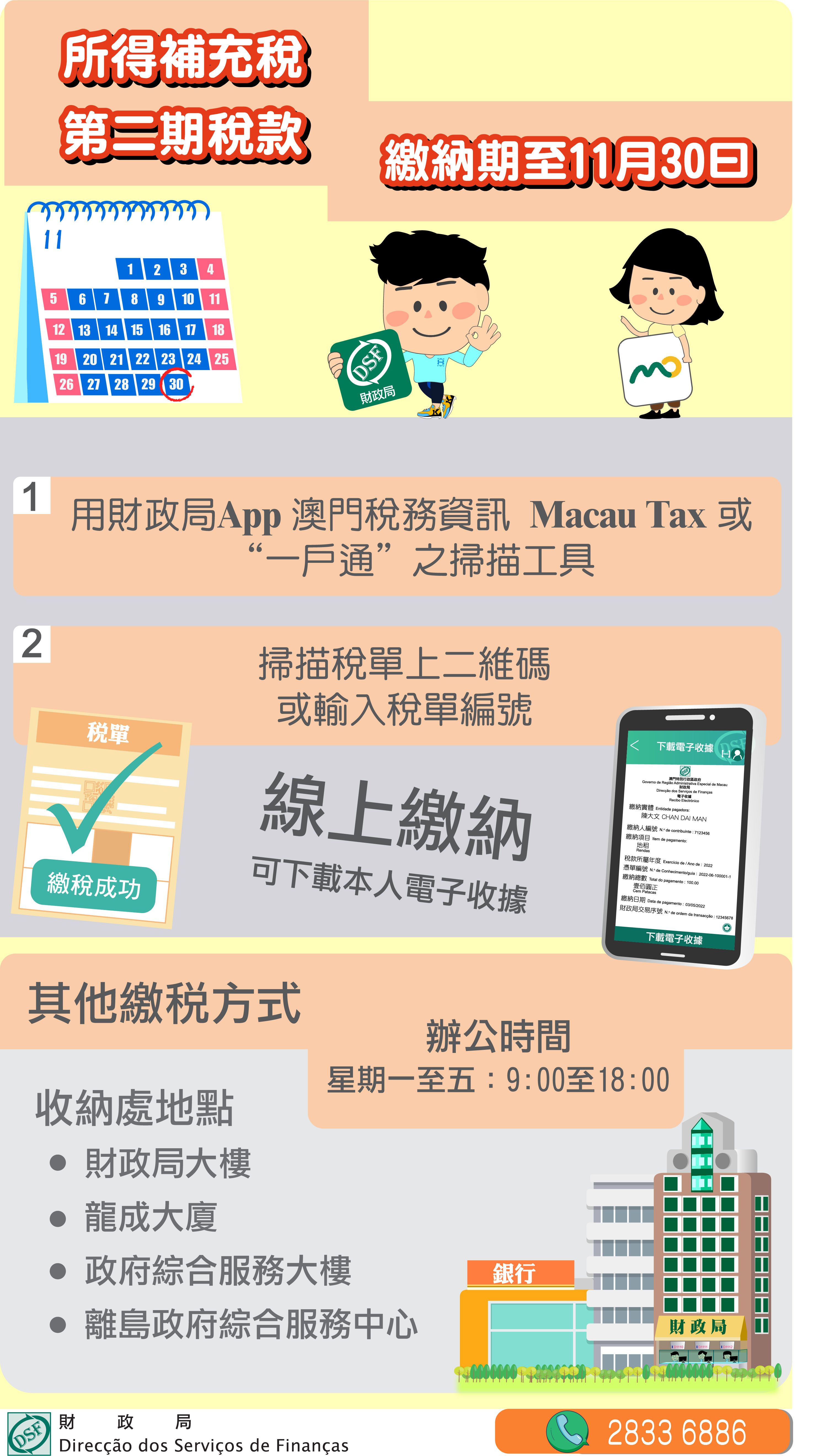 財政局提醒納稅人,繳納月份為11月之第二期所得補充稅,繳納期限至11月30日止,逾期繳納,將加徵過期利息及欠繳稅款百分之三。