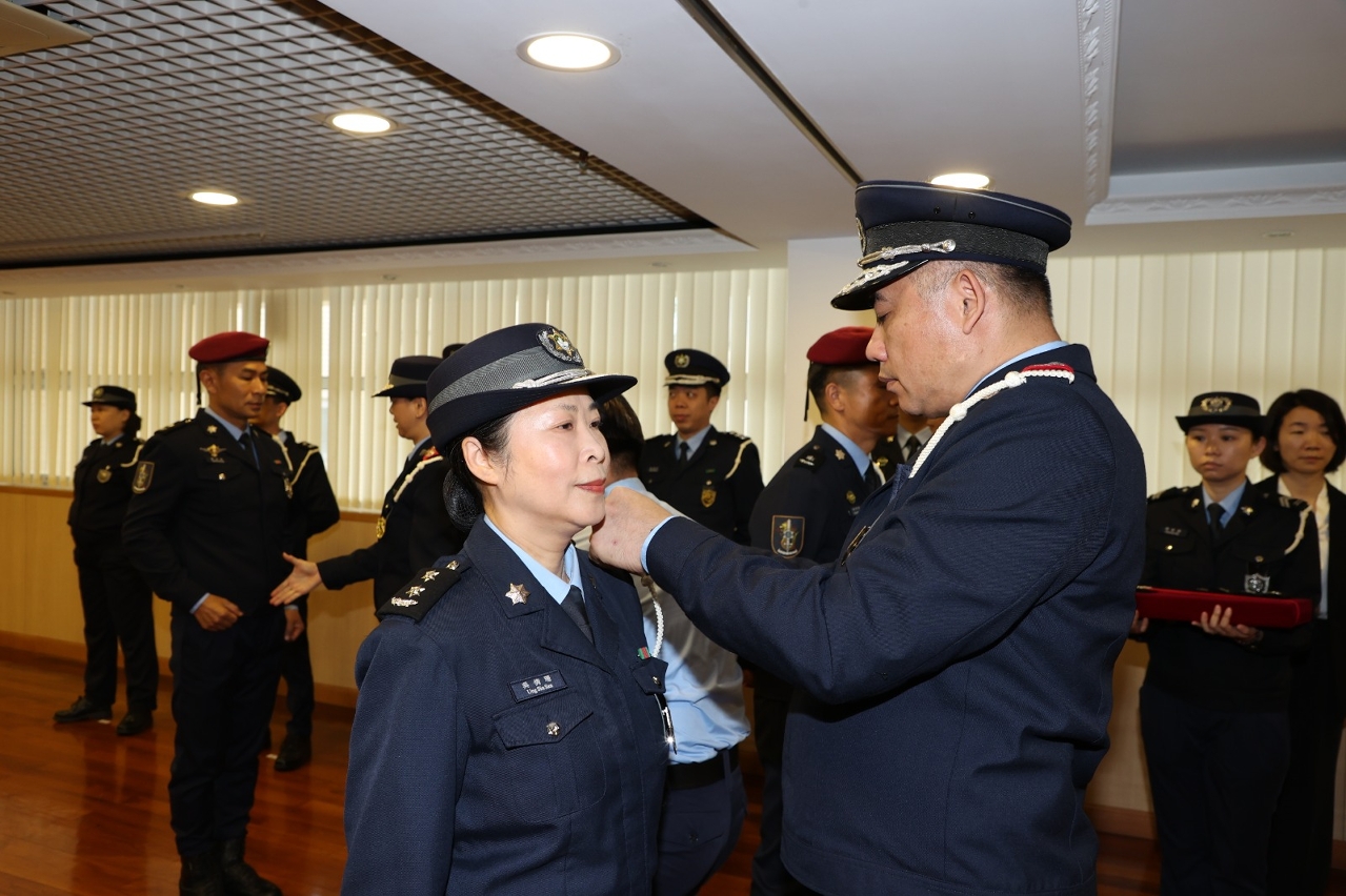 治安警察局於今(15)日在總部舉行高級警長晉升儀式,儀式由吳錦華局長主持,黃偉鴻副局長、梁慶康副局長、伍素萍副局長及各部門主管亦出席儀式,為晉升同僚致賀。