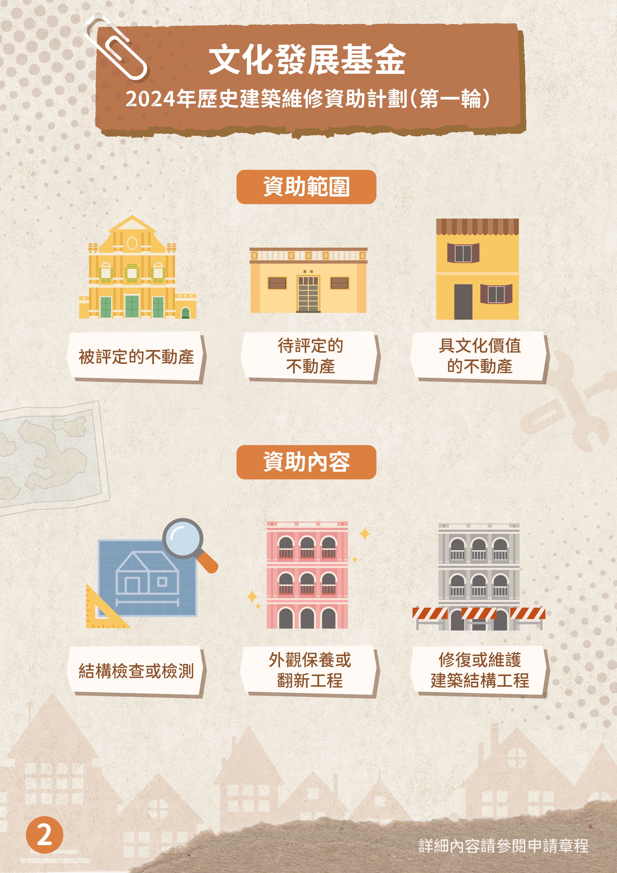 資助計劃支持業權人定期對私人文物建築和具文化價值建築開展結構檢查或檢測、實施外觀保養,以及因應檢測結果實施必要的修復及維護等工作。文化發展基金將對申請項目作資格及文件審查,並送交文化局進行技術分析,接着會交由文化遺產委員會就該申請建築物的文化價值、維修的迫切性和必要性,以及對提升社會認知和文遺保護的正面意義等因素發表意見。倘申請項目獲初步通過,基金將通知申請人提交由顧問服務公司擬定的歷史建築維修方案,後續由基金的活動和項目評審委員會就申請項目的維修工程必要性、建築物狀態的預期改善效果、預算合理性作出評分。