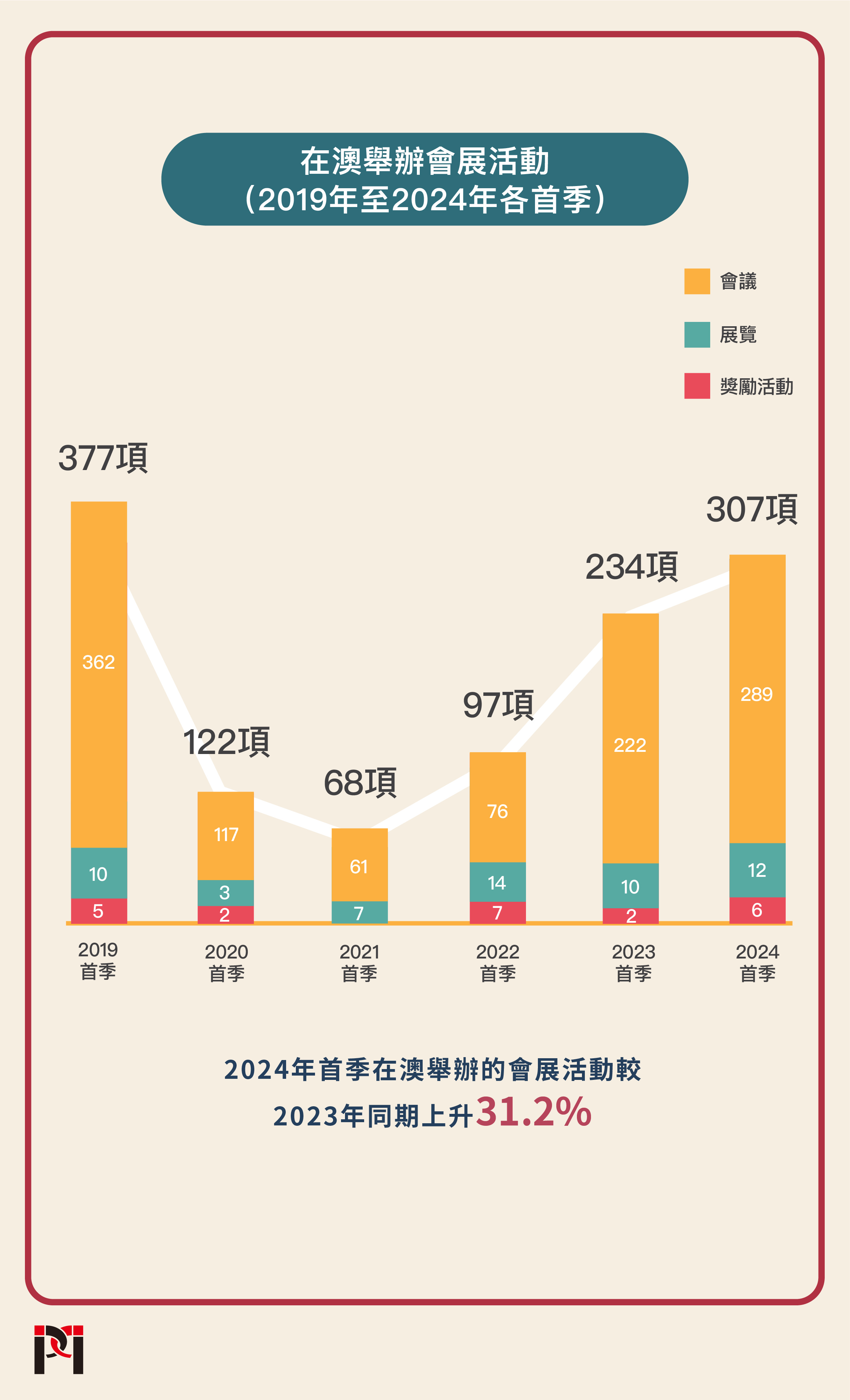 與此同時,貿促局圍繞“1+4”規劃持續以會展活動及招商引資服務加強與其他重點產業聯動,精準對接“1+4”產業發展需求。根據統計暨普查局數據,2024年首季在澳舉辦的會展活動達307項,較去年同期(234項)上升31.2%,其中展覽數目超越2019年同期水平。