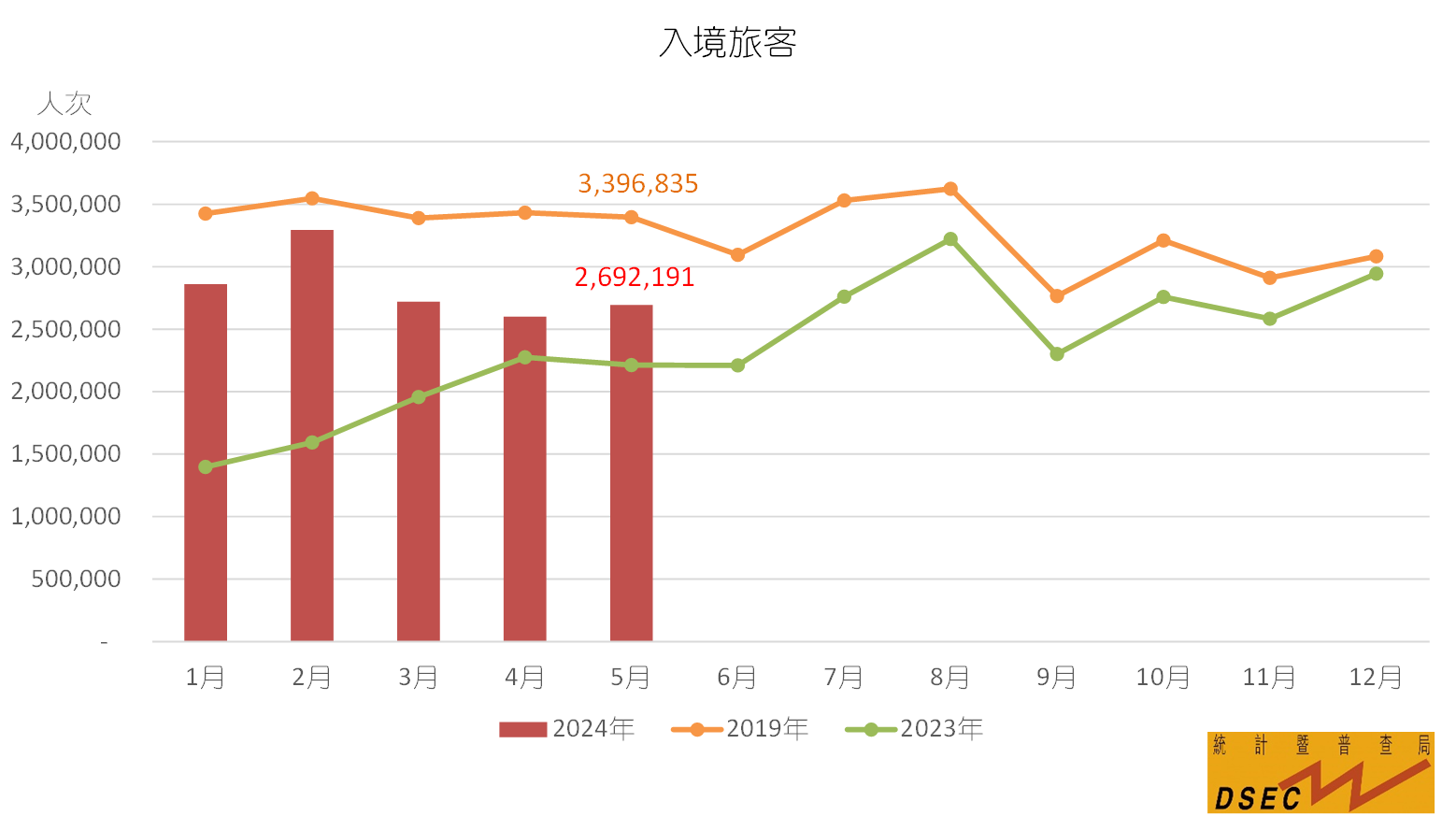 統計暨普查局資料顯示,今年5月入境旅客共2,692,191人次,按年上升21.6%,恢復至2019年同期的79.3%;與4月比較上升3.5%。不過夜旅客(1,430,741人次)及留宿旅客(1,261,450人次)按年分別增加27.2%及15.9%。旅客平均逗留1.2日,與去年同月持平;不過夜旅客的平均逗留時間維持在0.2日,留宿旅客則增加0.1日至2.3日。