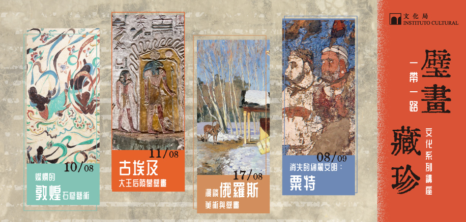 文化局將於本年8月至9月期間在澳門藝術博物館演講廳舉辦4場“壁畫藏珍──一帶一路文化系列講座”,分別介紹敦煌、古埃及、俄羅斯及粟特的壁畫藝術與文化風情。活動費用全免,歡迎有興趣人士於7月4日上午10時起透過“一戶通”報名參加。