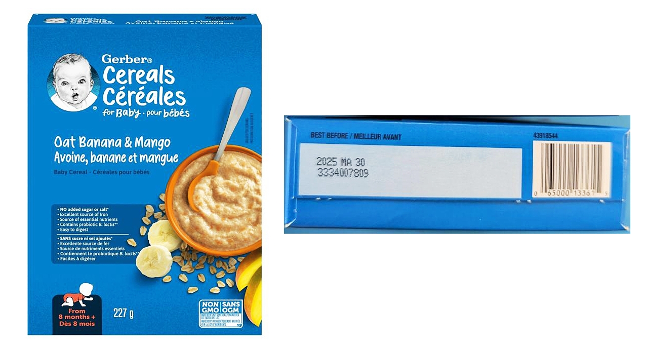 涉事產品名稱為“Oat Banana & Mango Baby Cereal”,品牌為“Gerber®”,包裝227克,產品編碼為0 65000 13361 5,批次編碼為2025 MA 30 3334007809。