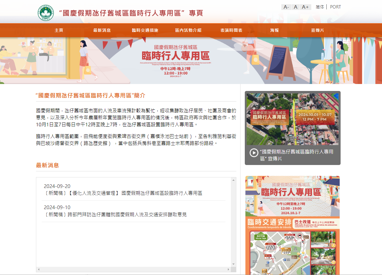 “國慶假期氹仔舊城區臨時行人專用區”各項籌備工作已準備就緒,政府跨部門與氹仔舊城區的社團、商會及商戶,一直保持緊密聯繫,共同落實做好這項措施,確保國慶期間該區人流及交通有序通行,營造舒適安全的步行環境。