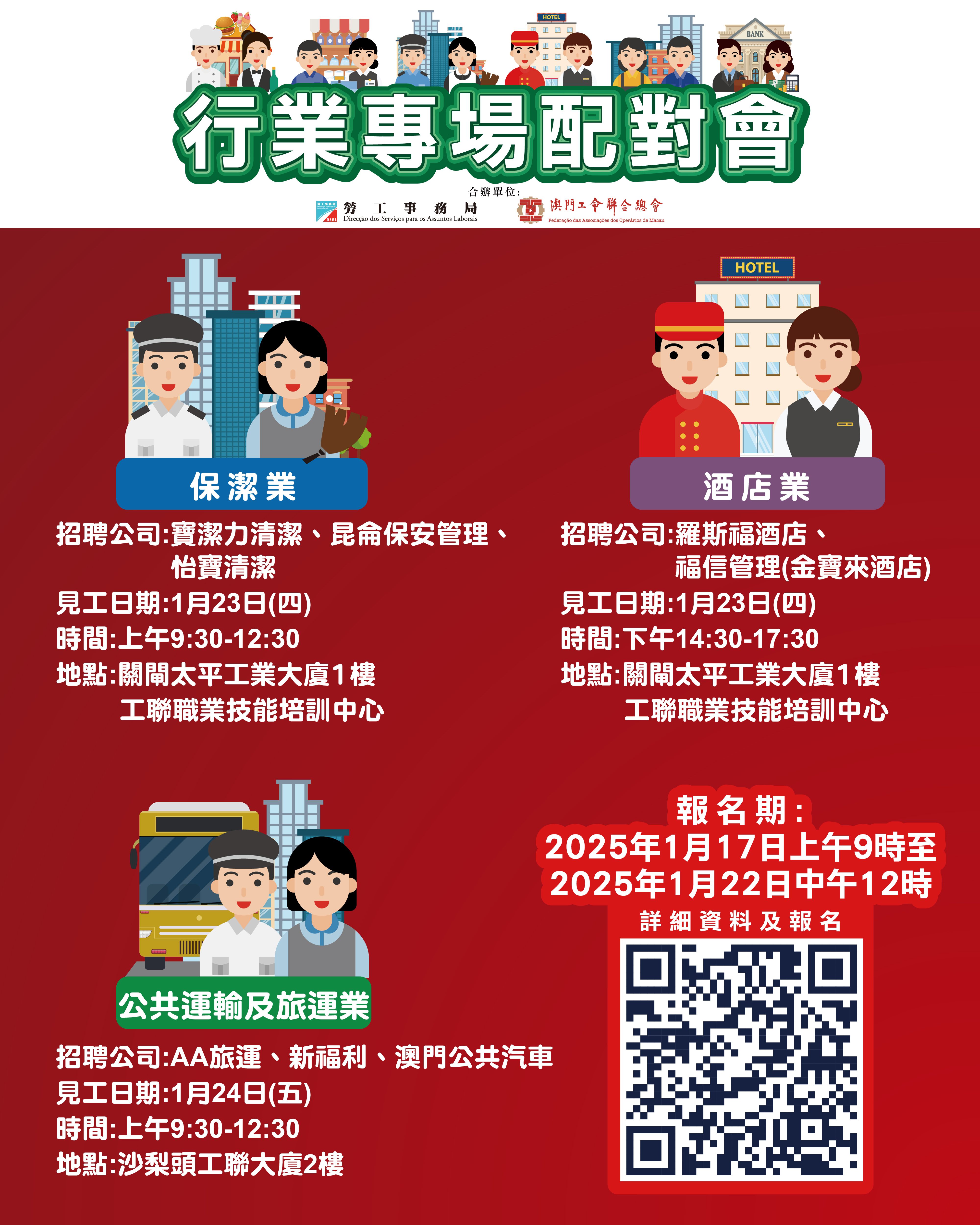 為協助有求職需求的澳門居民盡快就業,以及為緩解業界的人資需求壓力,勞工事務局與澳門工會聯合總會合作1月下旬舉辦3場行業專場配對會,合共提供207個空缺。報名日期為1月17日上午9時至1月22日中午12時。