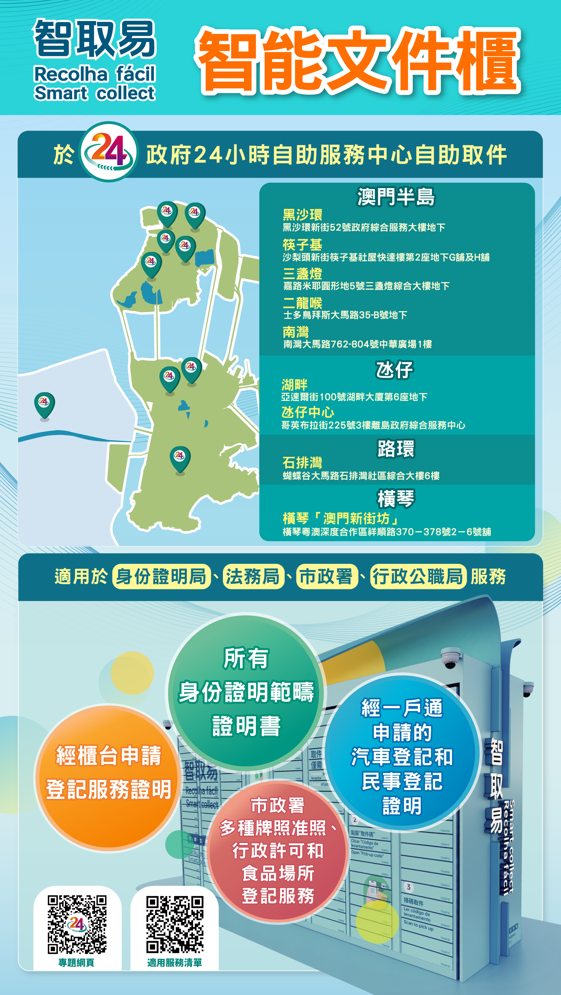 現階段,“智取易”適用於身份證明局所有身份證明範疇的證明書;法務局經櫃枱申請的登記證明,以及經“一戶通”線上申請的汽車、民事登記證明;市政署多種牌照准照、行政許可和食品場所登記服務等,涵蓋居民、企業和社團常用的線上線下服務事項。未來,特區政府將有序擴展“智取易”的適用範圍,逐步納入不同部門的申請項目,推動更多服務實現“高效辦理,便捷取件”。