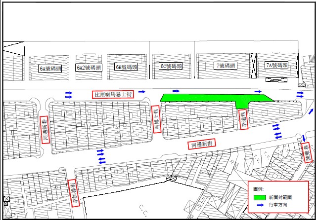 ● 2025年3月15日至4月30日圍封馬博士巷及李道巷之間的一段比厘喇馬忌士街,期間比厘喇馬忌士街將實施有限度通車,李道巷將實施無出口道路,即車輛不能經李道巷右轉進入河邊新街(附圖三)。