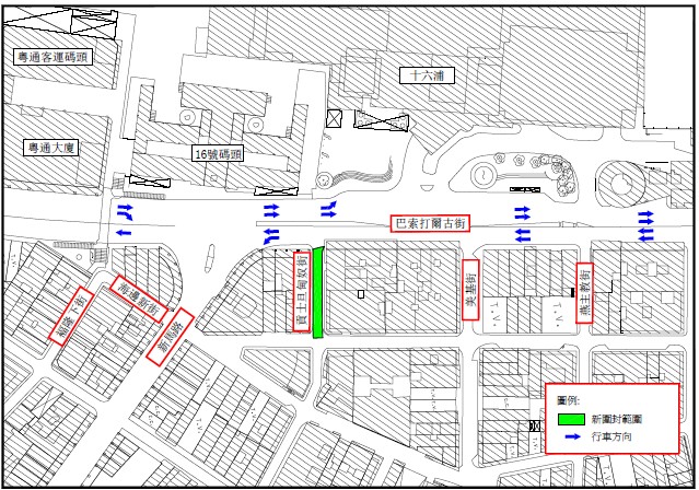 ● 2025年3月5日至4月30日圍封近十六浦的貢士旦甸奴街,期間介乎巴素打爾古街與通商新街之間的一段貢士旦甸奴街實施封閉交通(附圖一)。