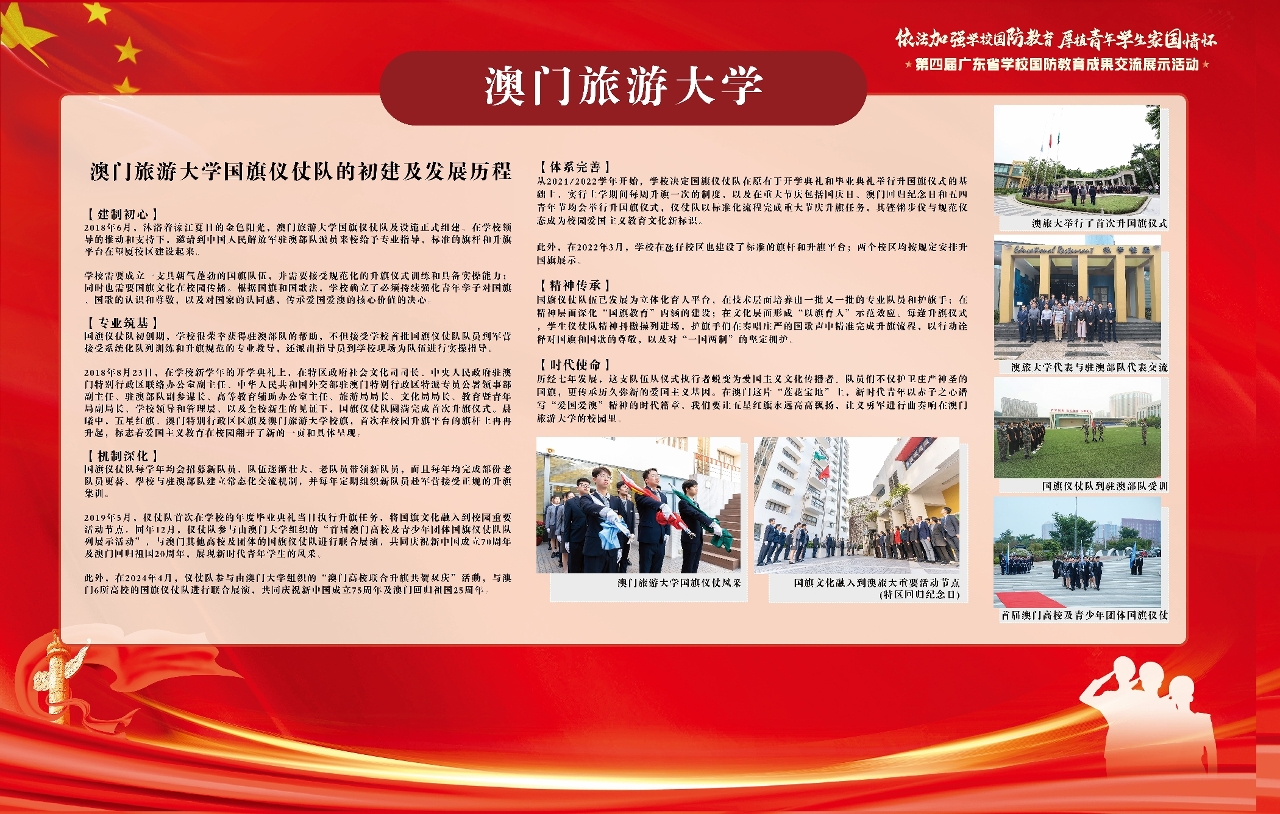 此次活動由廣東省教育廳、 廣東省軍區戰備建設局、 廣東省軍區動員局、共青團廣東省委員會聯合舉辦,吸引粵港澳三地160多所院校、逾6,500名師生代表參與共襄盛舉。澳門旅遊大學學生國旗儀仗隊透過圖文展板,呈現隊伍自2018年成立以來的訓練日常及重大活動參與,吸引了眾多參觀者駐足瞭解和交流。這次參展不僅是澳門旅遊大學國防教育成果的首次對外展示,更為粵港澳大灣區青年教育合作搭建了橋樑。