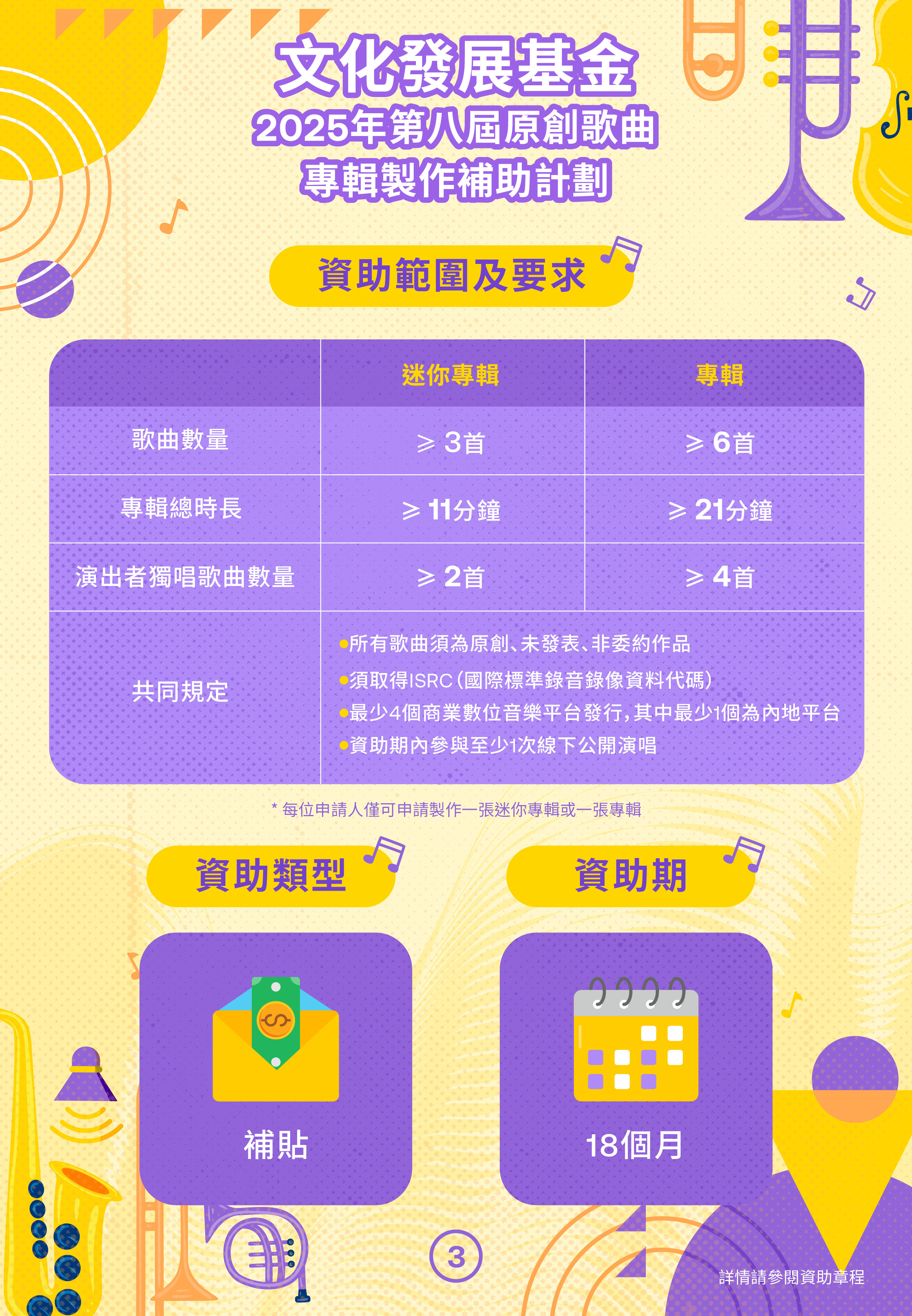 “第八屆原創歌曲專輯製作補助計劃”申請期由2025年12月31日至2026年2月13日。資助類型分為“迷你專輯”及“專輯”兩類,不包括合輯及精選輯。所有歌曲須為未曾發表及演出的原創、非委約作品。“迷你專輯”須包含至少3首歌曲,“專輯”則須至少6首。受資助專輯必須於最少4個商業數位音樂平台發行,其中至少1個須為內地平台,並需參與至少1次線下公開演唱,演出受資助專輯內至少1首歌曲。每一申請人僅限申請製作一張迷你專輯或一張專輯。