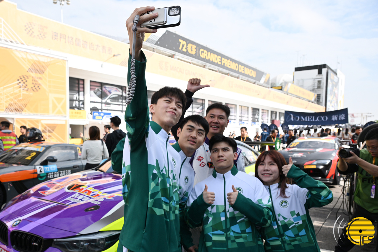 • Macao athletes pose for a selfie with a local driver, representing a synergistic link between the 15th National Games and the Macau Grand Prix.