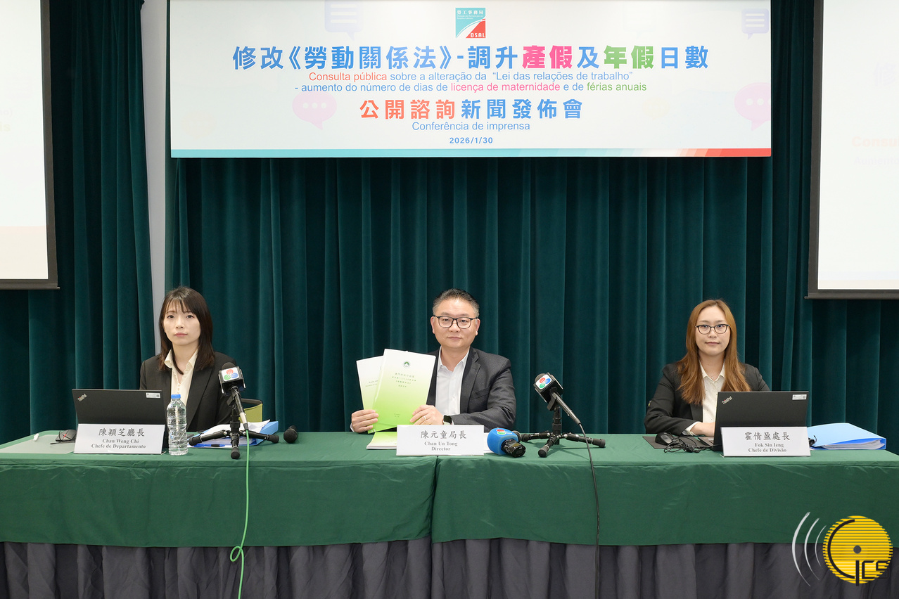 The Labour Affairs Bureau holds a press conference regarding a public consultation on amendments to Law No. 7/2008 on Labour Relations Law concerning increases to maternity leave and annual leave entitlements.