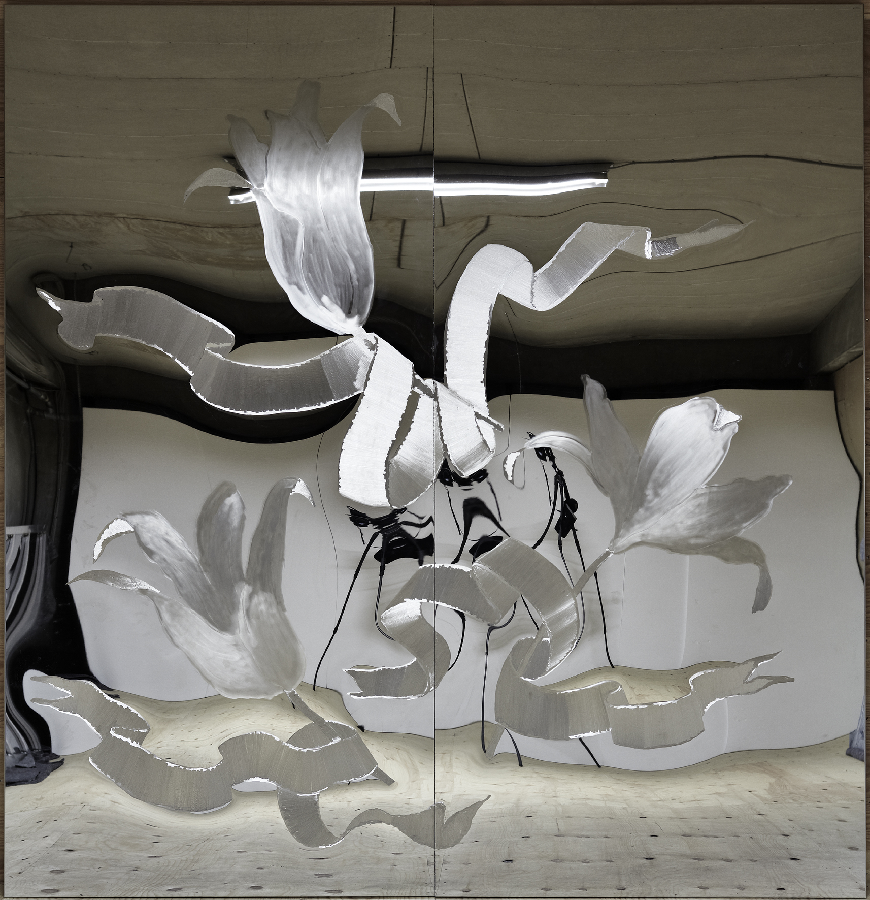 The stainless steel engravings featured in the forthcoming exhibition highlight the unique properties and characteristics of the material. Icy cold colours and tranquil motifs combine with the reflections of the viewing audience to create a variety of illusory moving images.