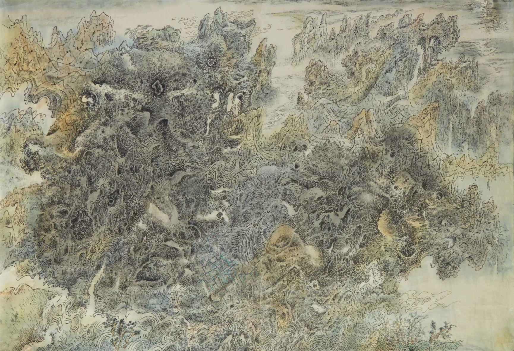 Leung Kui Ting studied painting under renowned artist Lui Shou-kwan and learnt design with Wucius Wong in his early years. He founded the Hong Kong Chingying Institute of Visual Arts in 1980 and worked as a part-time lecturer at the Hong Kong Polytechnic University over ten years. Currently he is an art expert adviser of the Leisure and Cultural Services Department of Hong Kong S.A.R. Government. Leung reveals that he feels the external world with the heart in order to achieve the unity of the mind and objects, so as to observe all things in the universe in the form of the objects themselves. Based on the transformation and exploration of Chinese traditional painting, his landscape ink paintings come from his heart and are abstracted from concrete appearance, instead of being mere reflections of reality. Leung invented a digital landscape painting technique which superimposes digital lines and dots on the outlines of mountains and rocks drawn in a traditional way, which makes his contemporary art ink works truly unique.