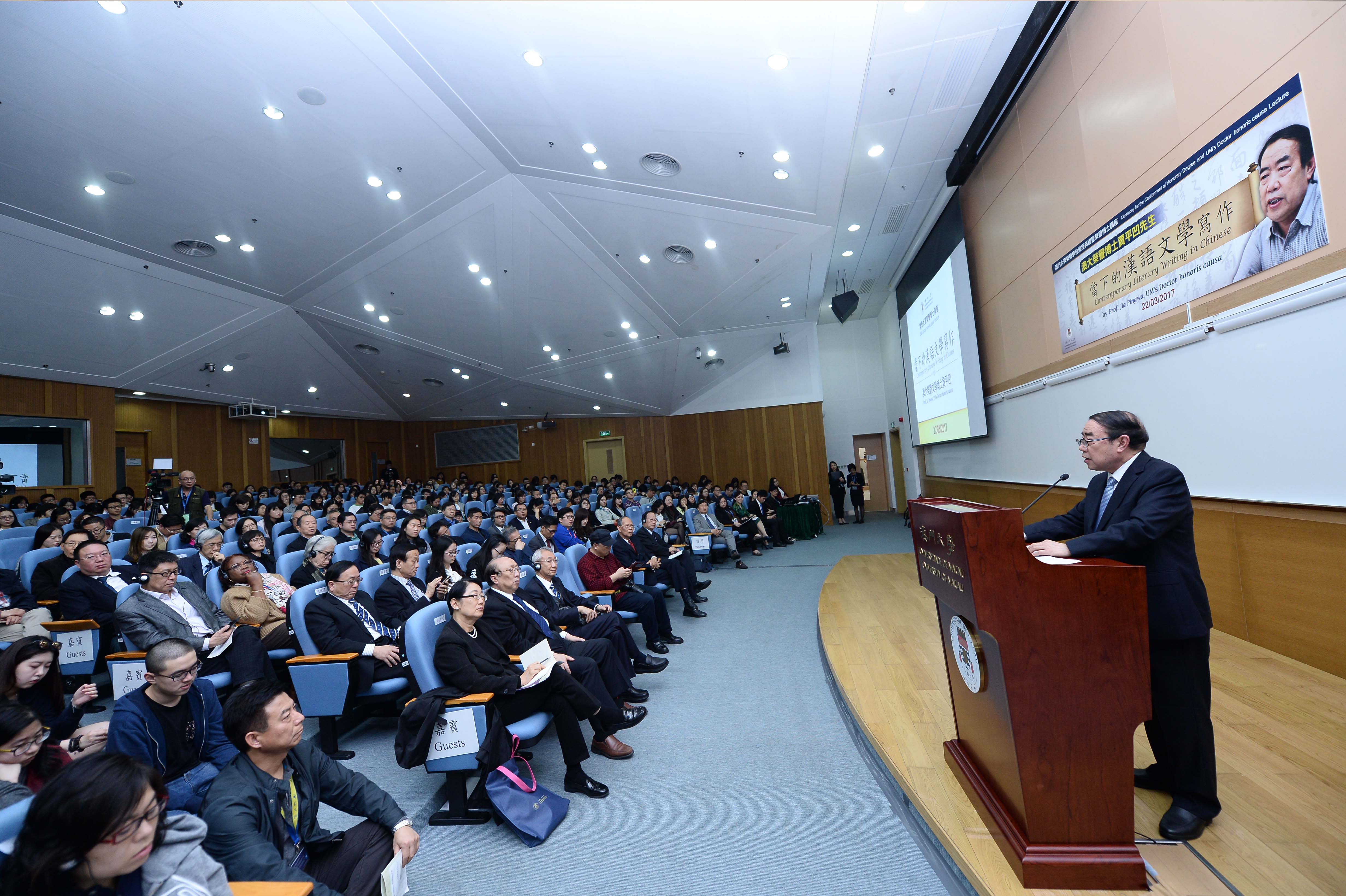 The University of Macau (UM) today (22 March) conferred a degree of Doctor of Letters honoris causa on the renowned writer Jia Pingwa, in recognition of his outstanding contributions to contemporary Chinese literature. Following the ceremony, Jia gave a Doctor honoris causa Lecture, titled ‘Contemporary Literary Writing in Chinese’, which attracted a full-house audience composed of UM faculty, students, and members of the public. Even the aisles were packed with people.