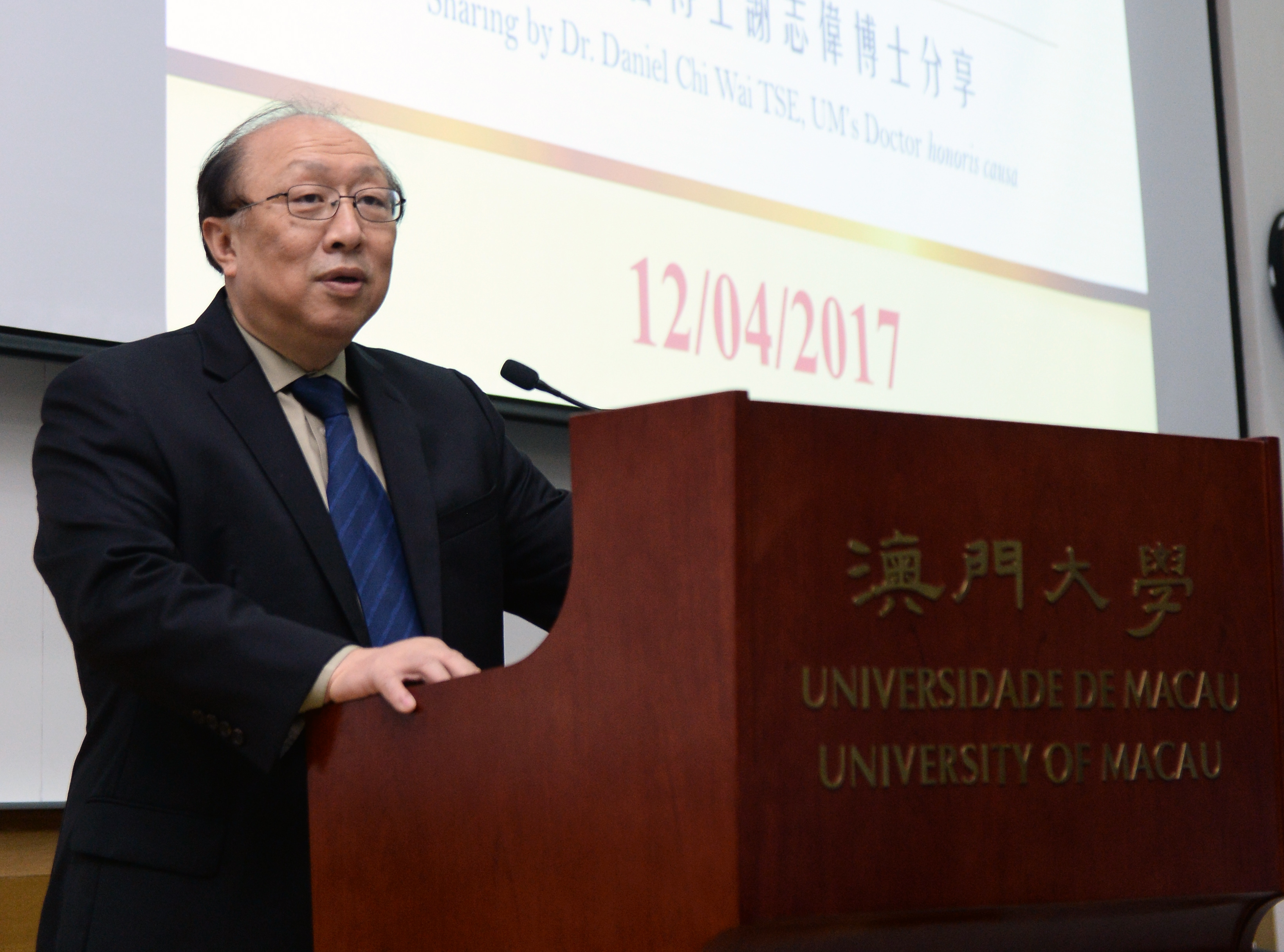 The University of Macau (UM) today (12 April) held a Doctor honoris causaLecture titled ‘A Stroke of Serendipity: How I Came to Join the Cause for the Advancement of Chinese Medicine’. Tse Chi Wai, UM’s honorary doctor and a renowned educator, was the keynote speaker. The lecture attracted a full-house audience.