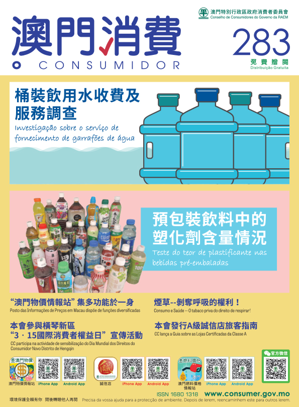 Consumer Report is now available free of charge at the Council (Av. Horta e Costa, N.º 26, Edf. Clementina Ho), and the service counter of the Council at Macao SAR Government Service Centre (Rua Nova da Areia Preta, Nº52), Public Information Centre at Vicky Plaza, libraries, and bookstores. Consumers may also access the magazine online on the Council’s official website (http://www.consumer.gov.mo) and WeChat official account.