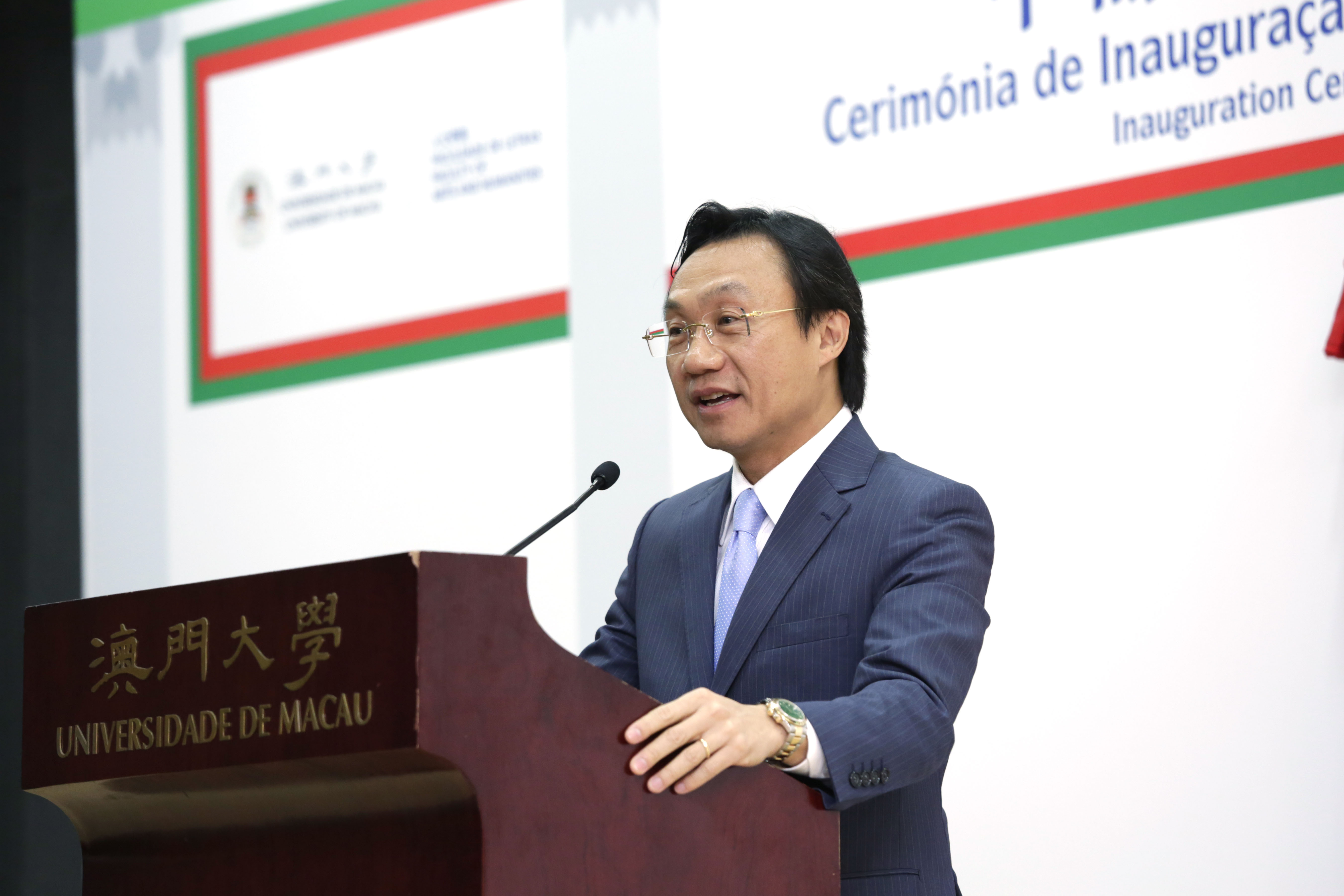 The University of Macau (UM) today (26 May) held an inauguration ceremony for the Chinese-Portuguese Bilingual Teaching and Training Centre. Secretary for Social Affairs and Culture Tam Chon Weng said that higher education institutions in Macao have better conditions than any university in mainland China to offer Portuguese language education. He expressed hope that faculty members of UM will work together at the Chinese-Portuguese Bilingual Teaching and Training Centre in order to nurture high-calibre bilingual professionals for Macao and China.