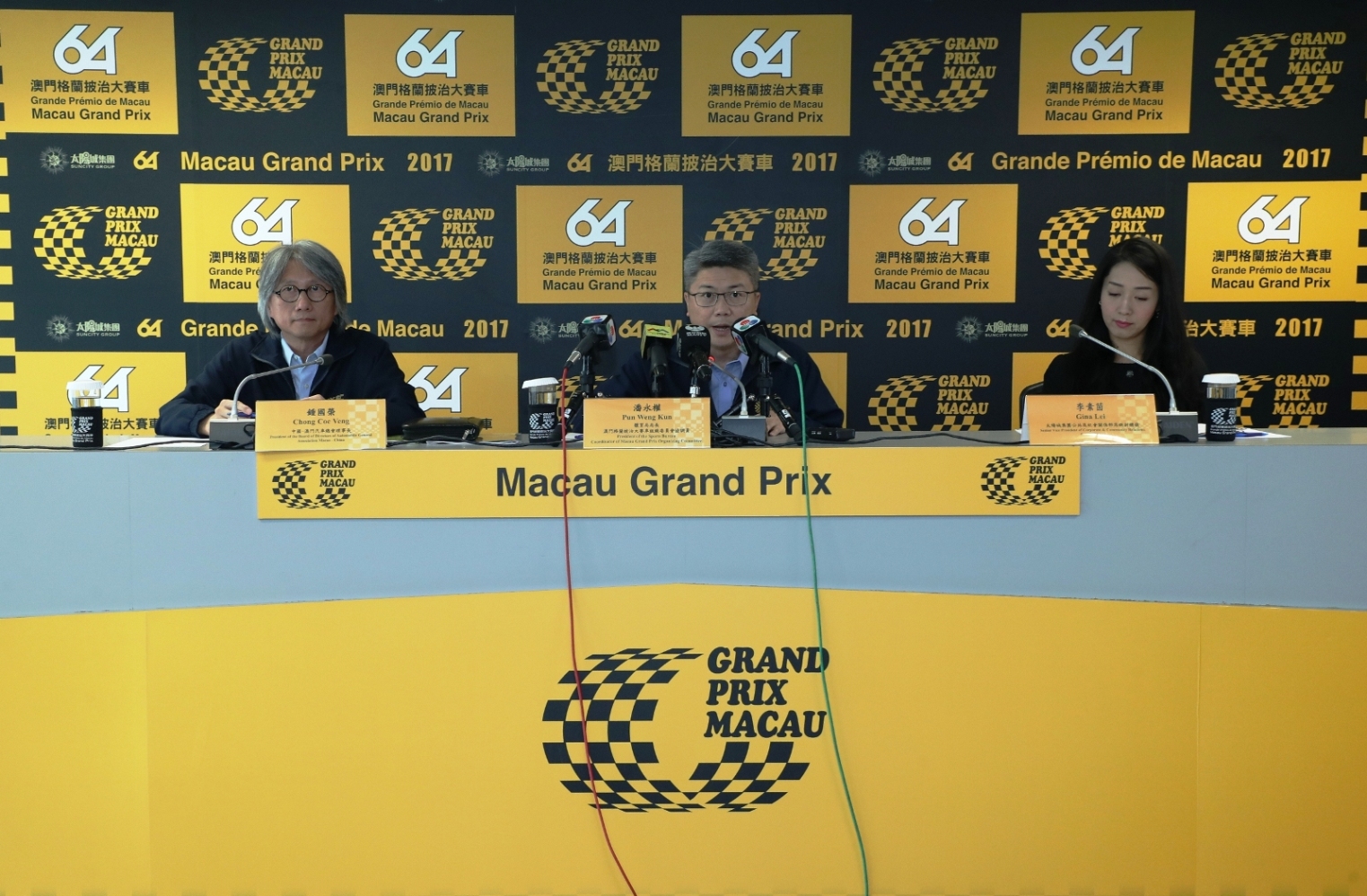 The press conference was attended by: Mr. Pun Weng Kun, President of the Sports Bureau of the Macao SAR Government and MGPOC Coordinator; Mr. Chong Coc Veng, President of the Automobile General Association of Macao-China; Ms. Gina Lei, Senior Vice President - Corporate & Community Relations of title sponsor Suncity Group.