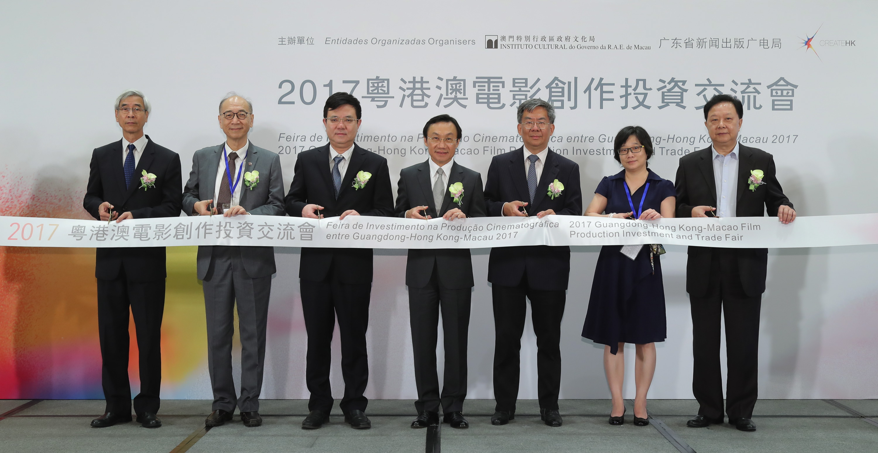 The opening ceremony of the Investment Fair was held on 25 July (Tuesday), at 10am, and was officiated by the Secretary for Social Affairs and Culture, Alexis Tam Chon Weng; the Deputy Director of the Liaison Office of the Central People’s Government in the Macao SAR, Xue Xiaofeng; the President of the Cultural Affairs Bureau of the Macao S.A.R. Government, Leung Hio Ming; the Assistant Head of Create Hong Kong, Wellington Fung; the Representative and Deputy Chief of the Film Management Office of the Administration of Press, Publication, Radio, Film and Television of Guangdong Province, Han Rui; the President of the Administrative Committee of the Cultural Industries Fund of the Macao S.A.R. Government, Leong Heng Teng; and the President of the Guangdong Motion Picture Industry Association, Chen Chang Bing.
